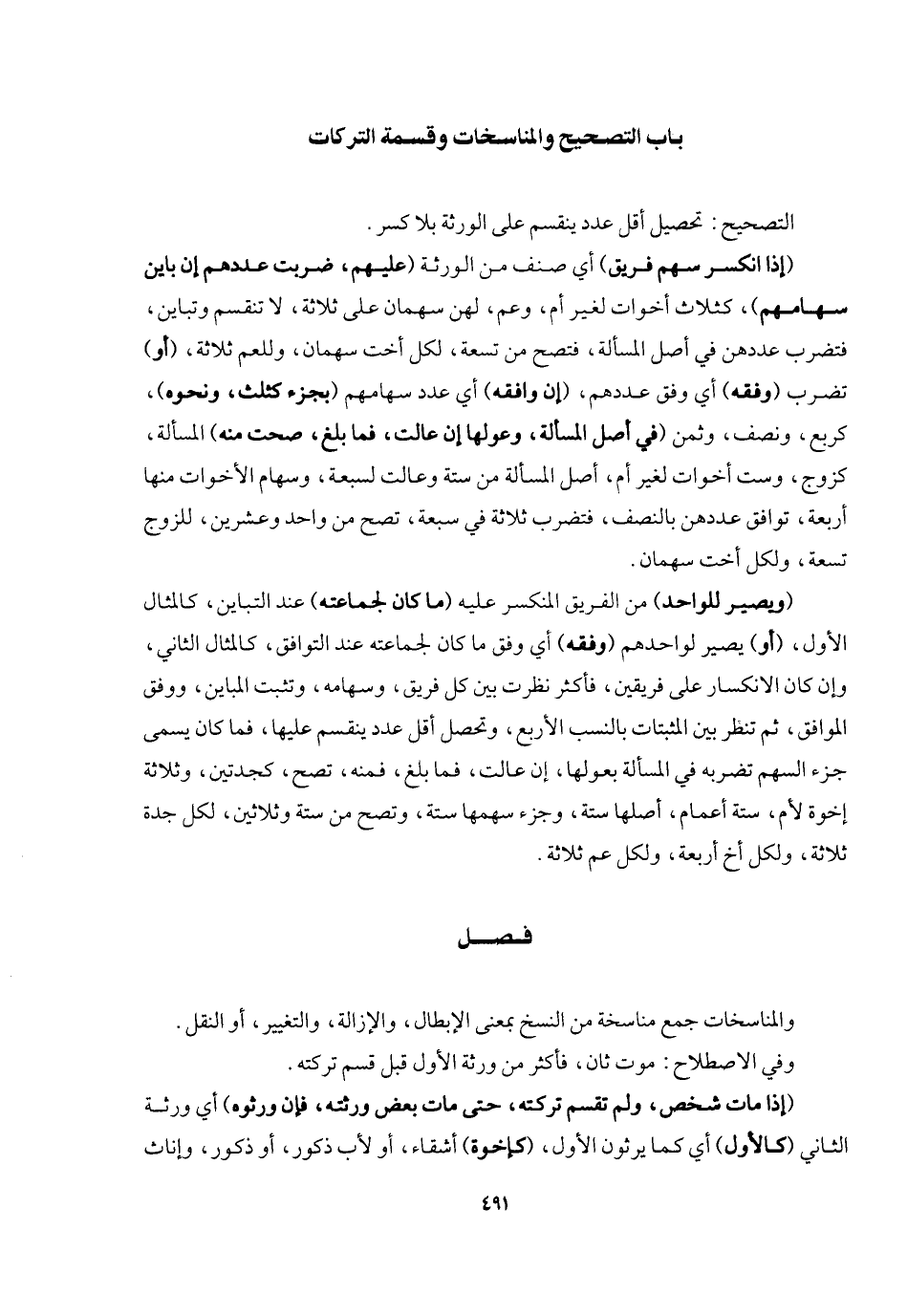 التصحيح تحصيل أقل عدد ينقسم على الورثة بلا كسر. (إذا انكسر سهم فريق) أي صنف من الورثة (عليهم ضربت عددهم إن باين سهامهم) ، كثلاث أخوات لغير أم وعم، لهن سهمان على ثلاثة لا تنقسم وتباين، فتضرب عددهم في أصل المسألة، فتصح من تسعة، لكل أخت سهمان وللعم ثلاثة، (أو) تضرب (وفقه) أي وفق عددهم (إن وافقه) أي عدد سهامهم (بجزء كثلث ونحوه) ، كربع ونصف وثمن (في أصل المسألة وعولها إن عالت فما بلغ صحت منه) المسألة كزوج وست أخوات لغير أم، أصل المسألة من ستة وعالت لسبعة