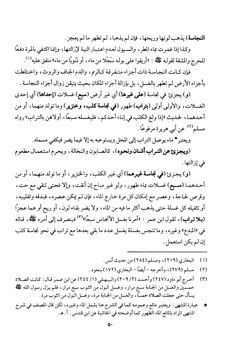 (و) يجزئ في نجاسة (على غيرها) أي غير أرض (سبع) غسلات (إحداها) أي إحدى الغسلات والأولى أولى (بتراب) طهور (في نجاسة كلب وخنزير) وما تولد منهما أو من أحدهما لحديث «إذا ولغ الكلب في إناء أحدكم فليغسله سبعا أولاهن بالتراب» رواه مسلم عن أبي هريرة مرفوعا. ويعتبر ما يوصل التراب إلى المحل ويستوعبه به إلا فيما يضر فيكفي مسماه. (ويجزئ عن التراب أشنان ونحوه) ، كالصابون والنخالة، ويحرم استعمال مطعوم في إزالتها، (و) يجزئ (في نجاسة غيرهما) أي غير الكلب والخنزير أو ما تولد