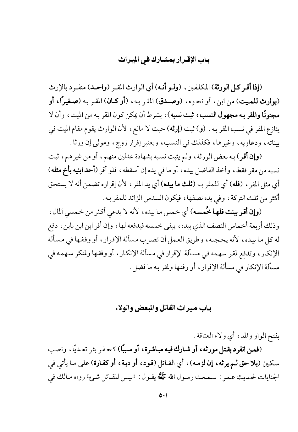 (وإن أقر ببنت فلها خمسه) أي خمس ما بيده، لأنه لا يدعي أكثر من خمسي المال، وذلك أربعة أخماس النصف الذي بيده، يبقى خمسه فيدفعه لها، وإن أقر ابن ابن بابن دفع له كل ما بيده لأنه يحجبه، وطريق العمل أن تضرب مسألة الإقرار أو وفقها في مسألة الإنكار وتدفع لمقر سهمه من مسألة الإقرار في مسألة الإنكار به أو وفقها ولمنكر سهمه من مسألة الإنكار في مسألة الإقرار أو وفقها ولمقر به ما فضل.