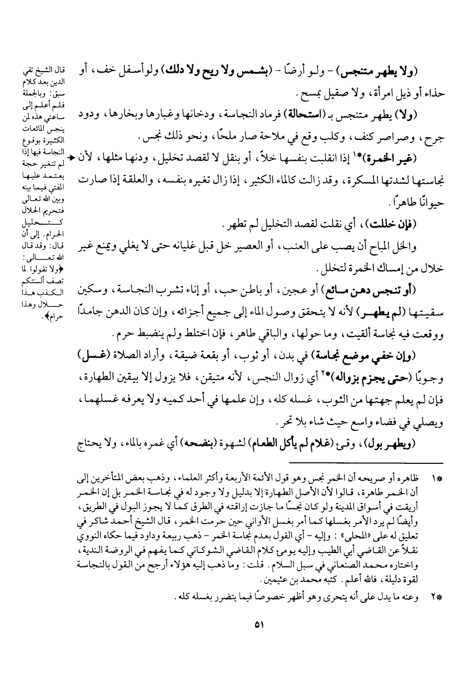 (ولا يطهر متنجس) ولو أرضا (بشمس ولا ريح ولا دلك) ولو أسفل خف أو حذاء أو ذيل امرأة ولا صقيل بمسح، (ولا) يطهر متنجس بـ (استحالة) فرماد النجاسة وغبارها وبخارها ودود جرح وصراصر كنف وكلب وقع في ملاحة صار ملحا، ونحو ذلك نجس (غير الخمرة) إذا انقلبت بنفسها خلا أو بنقل لا لقصد تخليل ودنها مثلها؛ لأن نجاستها لشدتها المسكرة وقد زالت كالماء الكثير إذا زال تغيره بنفسه، والعلقة إذا صارت حيوانا طاهرا (فإن خللت) أو نقلت لقصد التخليل لم تطهر.