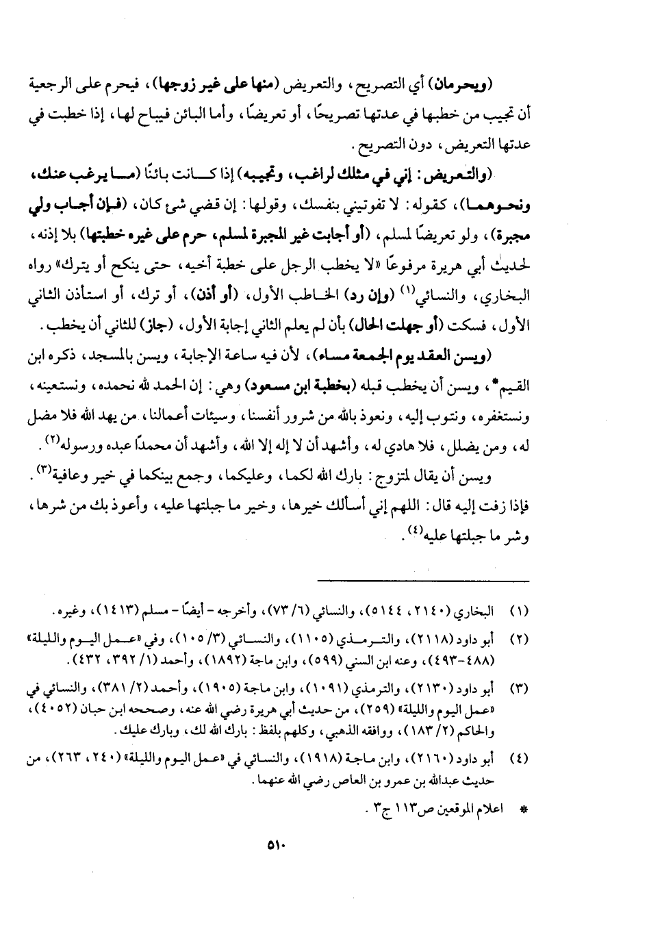 (والتعريض: إني في مثلك لراغب، وتجيبه) إذا كانت بائنا (ما يرغب عنك، ونحوهما) كقوله: لا تفوتيني بنفسك، وقولها: إن قضي شيء كان، (فإن أجاب ولي مجبرة) ولو تعريضا لمسلم (أو أجابت غير المجبرة لمسلم حرم على غيره خطبتها) بلا إذنه، لحديث أبي هريرة مرفوعا: «لا يخطب الرجل على خطبة أخيه حتى ينكح أو يترك» رواه البخاري والنسائي (وإن رد) الخاطب الأول (أو أذن) أو ترك أو