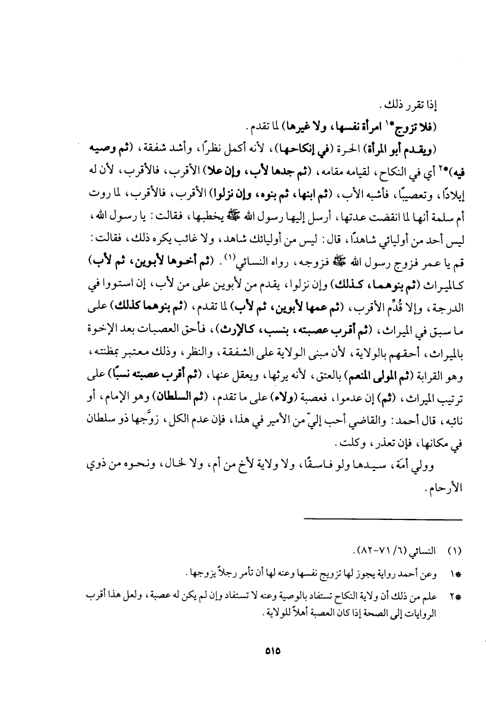 (ويقدم أبو المرأة) الحرة (في إنكاحها) ، لأنه أكمل نظرا وأشد شفقة، (ثم وصيه فيه) أي في النكاح لقيامه مقامه، (ثم جدها لأب وإن علا) الأقرب فالأقرب، لأن له إيلادا وتعصيبا فأشبه الأب، (ثم ابنها ثم بنوه وإن نزلوا) الأقرب فالأقرب لما «روت أم سلمة أنها لما انقضت عدتها، أرسل إليها رسول الله - صَلَّى اللَّهُ عَلَيْهِ وَسَلَّمَ - يخطبها، فقالت: يا رسول الله ليس أحد من أوليائي شاهدا، قال: ليس من أوليائك شاهد ولا غائب يكره ذلك، فقالت: قم يا عمر فزوج رسول الله - صَلَّى اللَّهُ عَلَيْهِ وَسَلَّمَ - فزوجه» . رواه النسائي. (ثم أخوها لأبوين ثم لأب) كالميراث (ثم بنوهما كذلك) وإن نزلوا، يقدم من لأبوين على من لأب إن استووا في الدرجة الأقرب فالأقرب، (ثم عمها لأبوين ثم لأب) لما تقدم، (ثم بنوهما كذلك) على ما سبق في الميراث، (ثم أقرب عصبته نسب كالإرث) ، فأحق العصبات بعد الإخوة بالميراث أحقهم بالولاية، لأن مبنى الولاية على الشفقة، والنظر، وذلك معتبر بمظنته وهو القرابة (ثم المولى المنعم) بالعتق لأنه يرثها ويعقل عنها (ثم أقرب عصبته نسبا) على ترتيب الميراث، (ثم) إن عدموا فعصبته (ولاء) على ما تقدم، (ثم السلطان) وهو الإمام أو نائبه، قال أحمد: والقاضي أحب إلي من الأمير في هذا، فإن عدم الكل زوجها ذو سلطان في مكانها، فإن تعذر وكلت. وولي أمة سيدها ولو فاسقا، ولا ولاية لأخ من أم ولا الخال ونحوه من ذوي الأرحام.