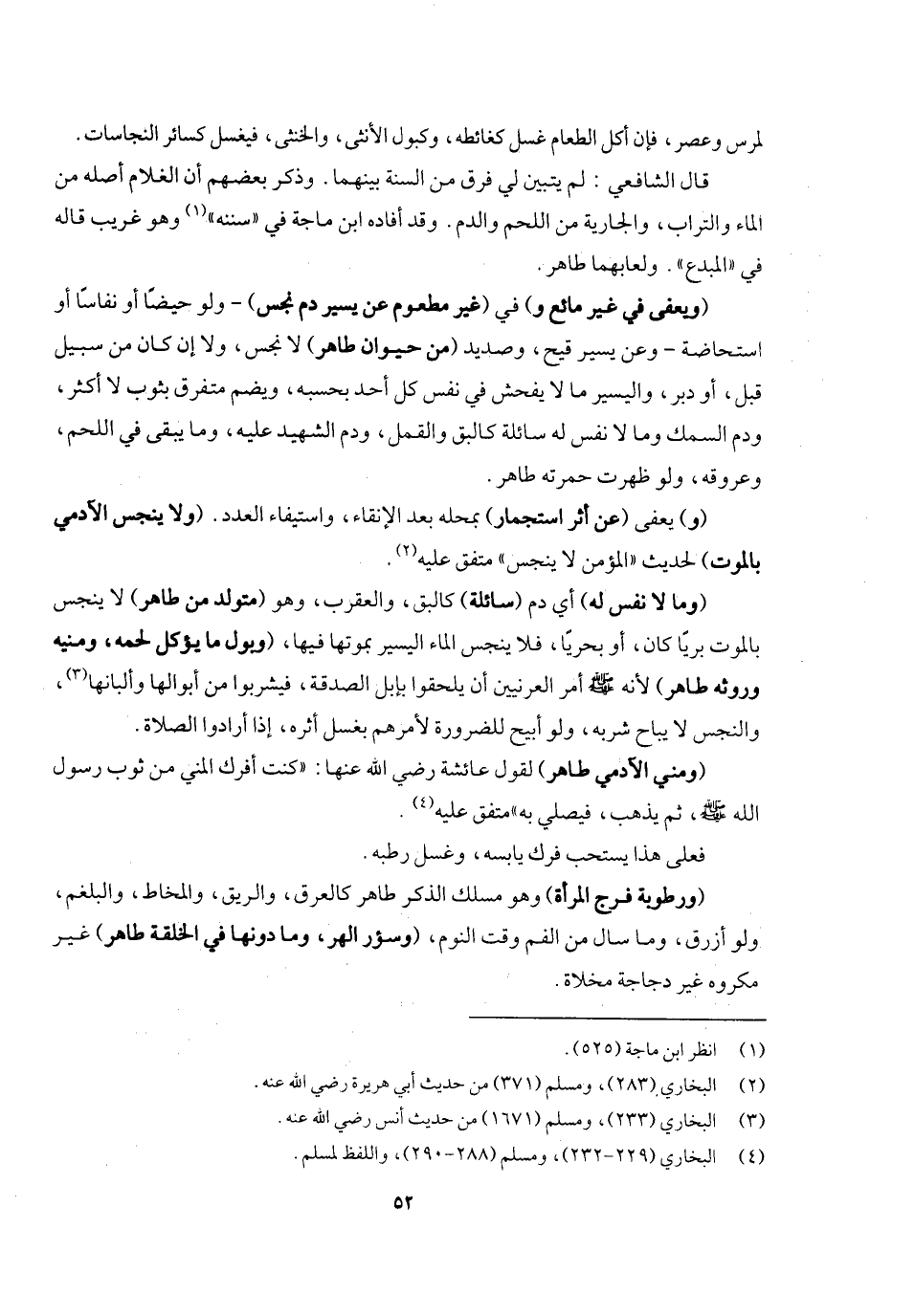 (ويعفى في غير مائع و) في (غير مطعوم عن يسير دم نجس) ولو حيضا أو نفاسا أو استحاضة وعن يسير قيح وصديد (من حيوان طاهر) لا نجس ولا إن كان من سبيل قبل أو دبر، واليسير ما لا يفحش في نفس كل أحد بحسبه، ويضم متفرق بثوب لا أكثر، ودم السمك وما لا نفس له سائلة كالبق والقمل، ودم الشهيد عليه وما يبقى في اللحم وعروقه، ولو ظهرت حمرته طاهر، (و) يعفى (عن أثر استجمار) بمحله بعد الإنقاء واستيفاء العدد. (ولا ينجس الآدمي بالموت) لحديث «المؤمن لا ينجس» متفق عليه.