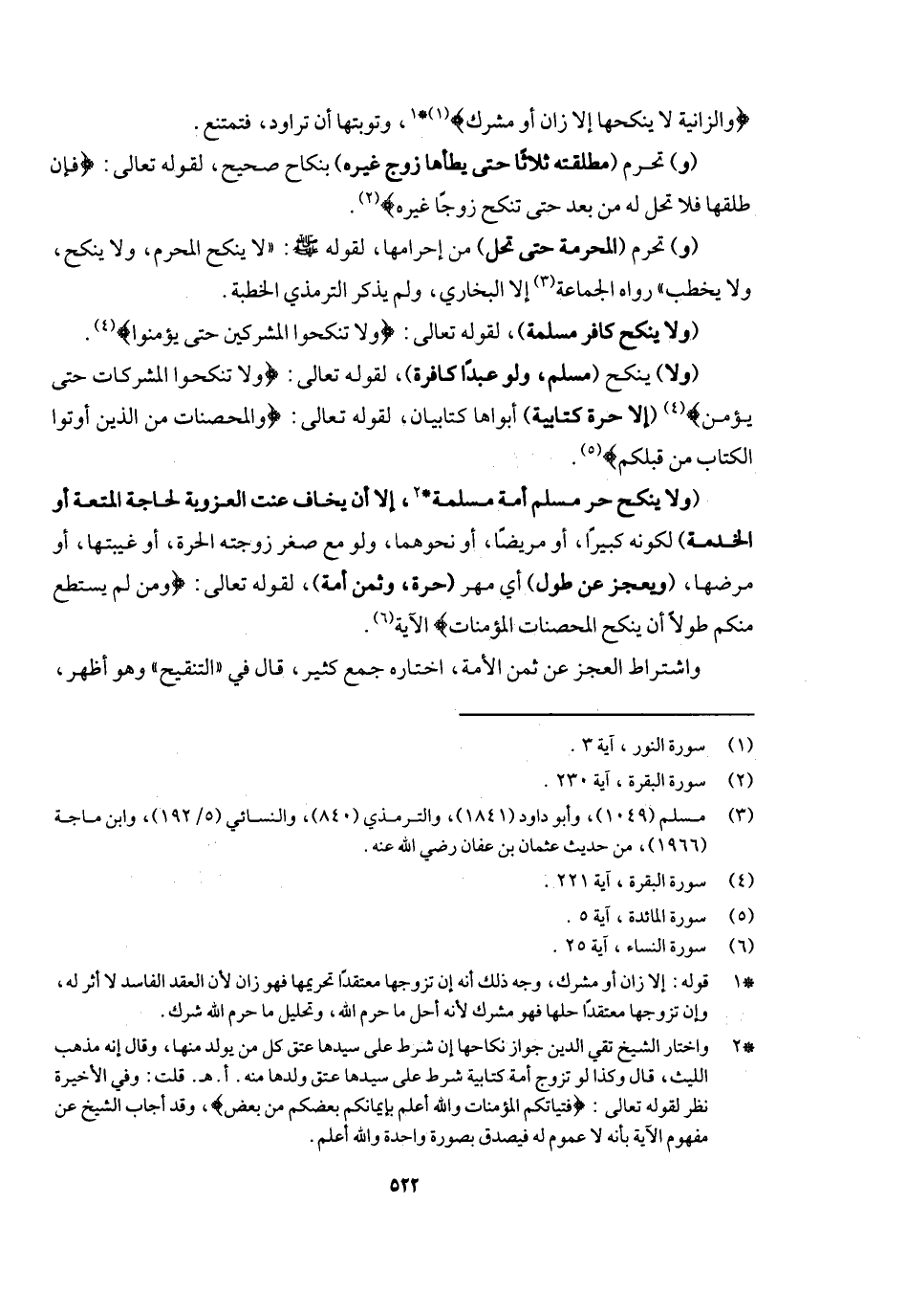 (و) تحرم (مطلقته ثلاثا حتى يطأها زوج غيره) بنكاح صحيح لِقَوْلِهِ تَعَالَى: {فَإِنْ طَلَّقَهَا فَلا تَحِلُّ لَهُ مِنْ بَعْدُ حَتَّى تَنْكِحَ زَوْجًا غَيْرَهُ} [البقرة: ٢٣٠] . (و) تحرم (المحرمة حتى تحل) من إحرامها لقوله - صَلَّى اللَّهُ عَلَيْهِ وَسَلَّمَ -: «لا ينكح المحرم ولا ينكح ولا يخطب» رواه الجماعة إلا البخاري، ولم يذكر الترمذي الخطبة.