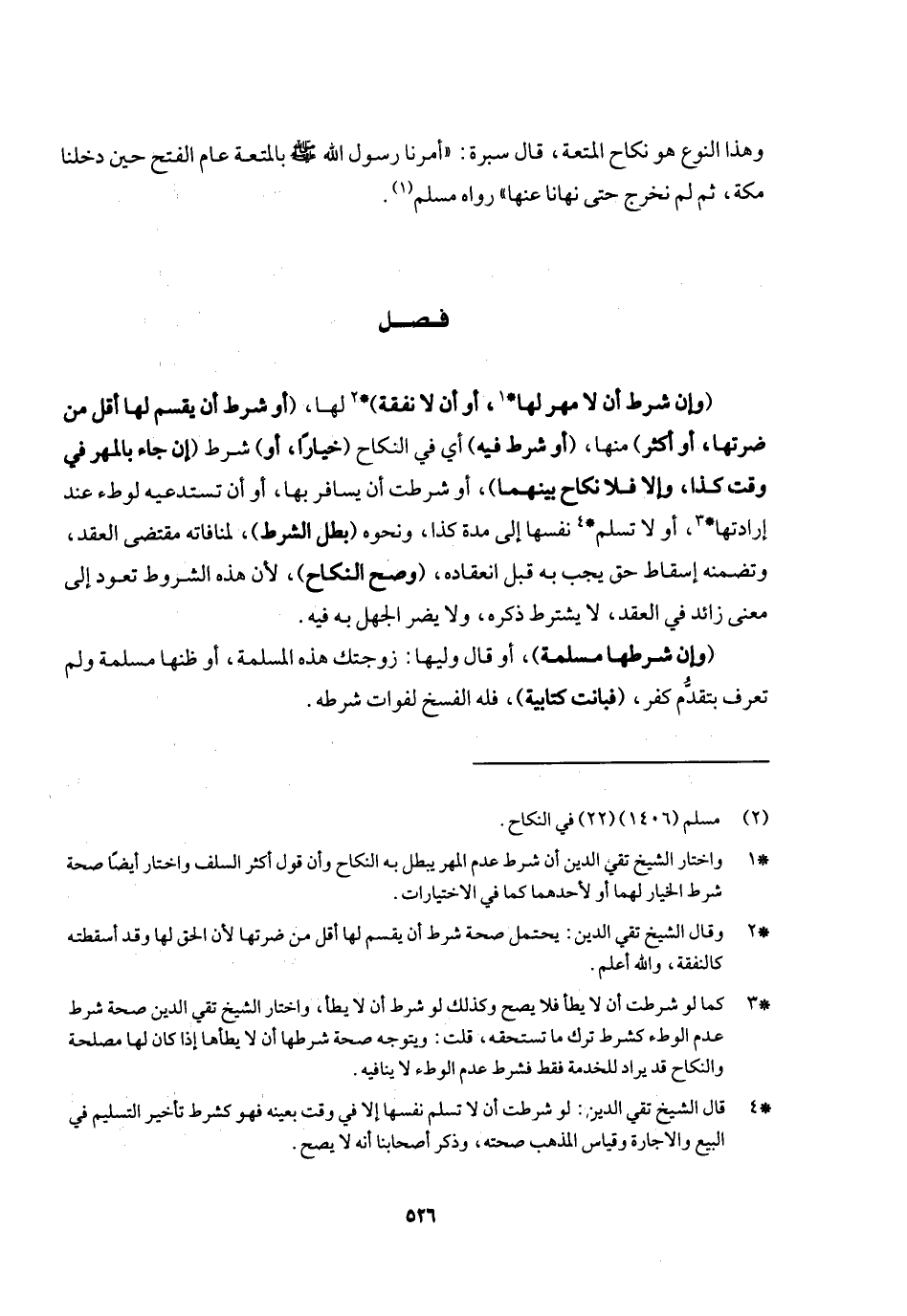 فصل (وإن شرط أن لا مهر لها أو أن لا نفقة) لها، (أو شرط أن يقسم لها أقل من ضرتها أو أكثر) منها، (أو شرط فيه) أي في النكاح (خيارا أو) شرط (إن جاء بالمهر في وقت كذا وإلا فلا نكاح بينهما) ، أو شرطت أن يسافر بها أو أن تستدعيه لوطء عند إرادتها أولا تسلم نفسها إلى مدة كذا ونحوه (بطل الشرط) ، لمنافاته مقتضى العقد، وتضمنه إسقاط حق يجب به قبل انعقاده. (وصح النكاح) لأن هذه الشروط تعود إلى معنى زائد في العقد لا يشترط ذكره، ولا يضر الجهل به فيه،