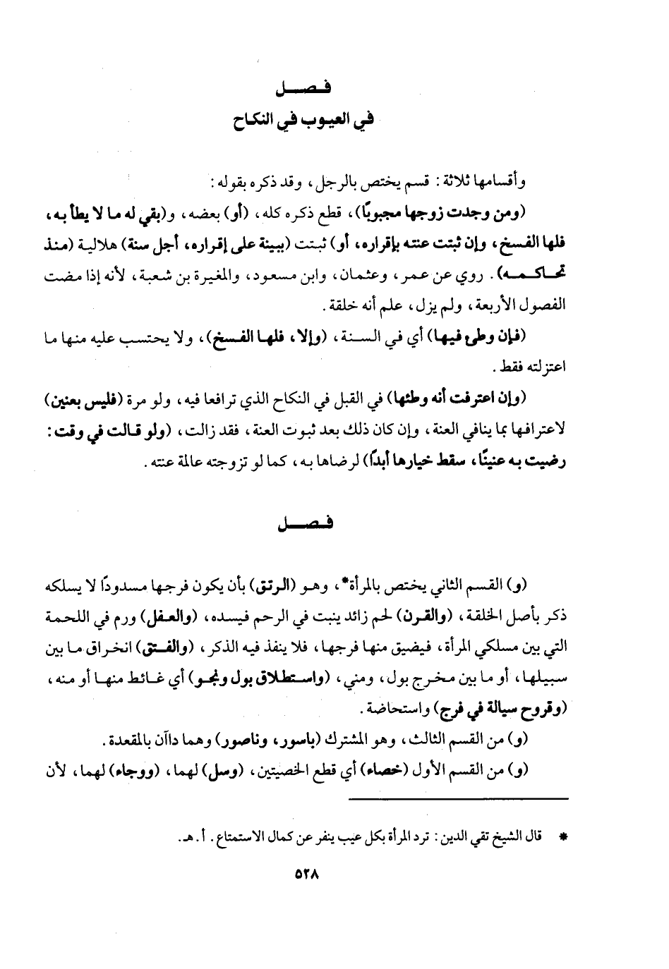 فصل (و) القسم الثاني يختص بالمرأة، وهو (الرتق) بأن يكون فرجها مسدودا لا يسلكه ذكر بأصل الخلقة، (والقرن) لحم زائد ينبت في الرحم فيسده، (والعضل) ورم في اللحمة التي بين مسلكي المرأة فيضيق منها فرجها فلا ينفذ فيه الذكر، (والفتق) انخراق ما بين سبيليها أو ما بين مخرج بول ومني، (واستطلاق بول ونجو) أي غائط منها أو منه، (وقروح سيالة في فرج) واستحاضة.