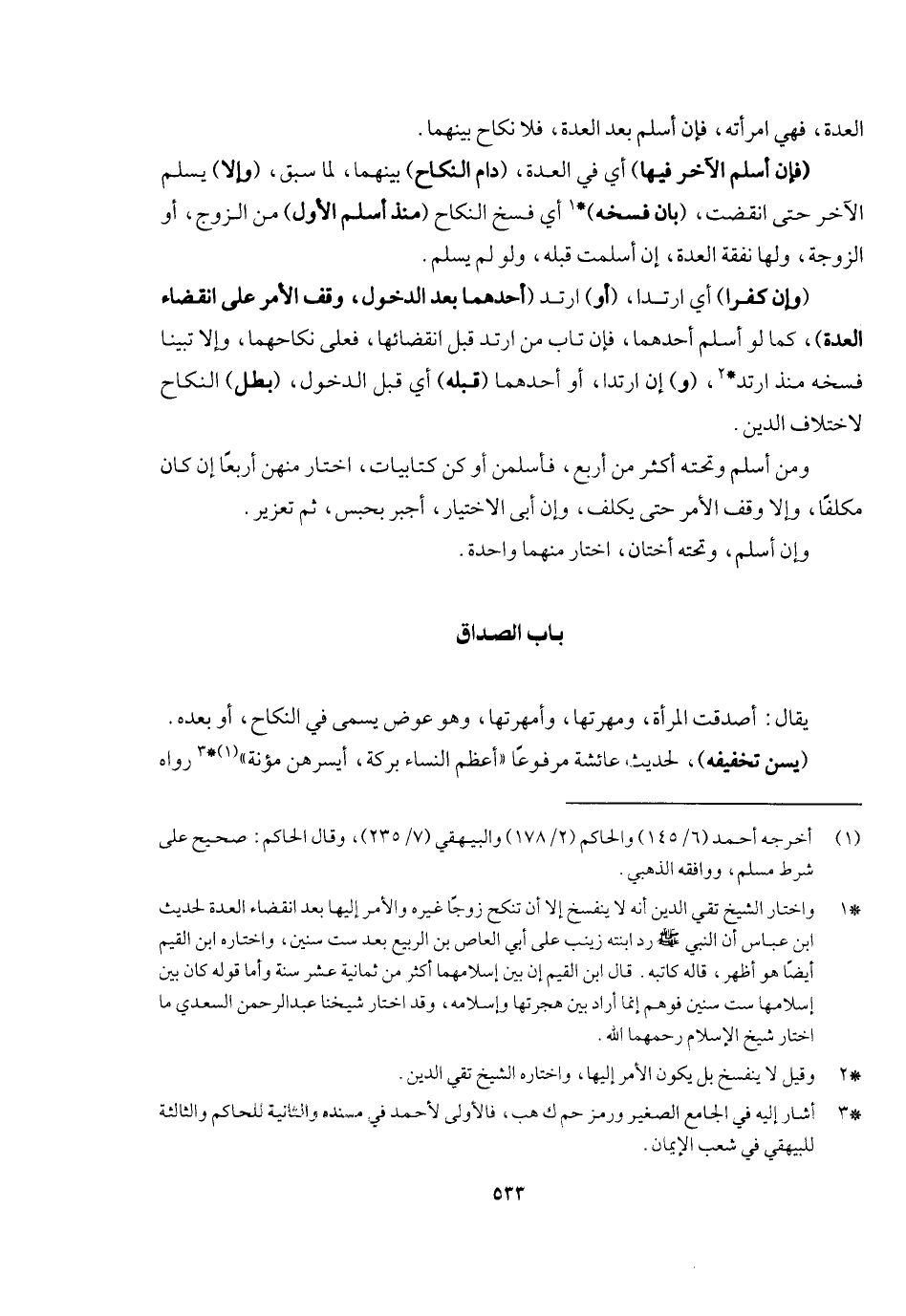 يقال: أصدقت المرأة ومهرتها وأمهرتها، وهو عوض يسمى في النكاح أو بعده. (يسن تخفيفه) لحديث عائشة مرفوعا «أعظم النساء بركة أيسرهن مؤنة» رواه