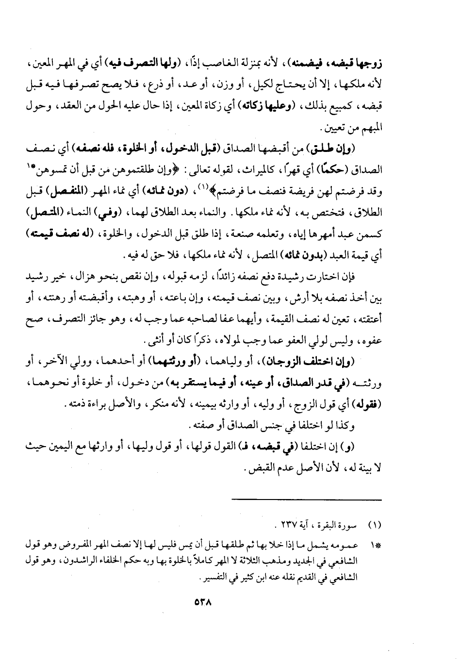 (وإن طلق) من أقبضها الصداق (قبل الدخول أو الخلوة فله نصفه) أي نصف الصداق (حكما) أي قهرا، كالميراث، لِقَوْلِهِ تَعَالَى: {وَإِنْ طَلَّقْتُمُوهُنَّ مِنْ قَبْلِ أَنْ تَمَسُّوهُنَّ وَقَدْ فَرَضْتُمْ لَهُنَّ فَرِيضَةً فَنِصْفُ مَا فَرَضْتُمْ} [البقرة: ٢٣٧] (دون نمائه) أي نماء المهر (المنفصل) قبل الطلاق فتختص به لأنه نماء ملكها. والنماء بعد الطلاق لهما، (وفي) النماء (المتصل) كسمن عبد أمهرها إياه وتعلمه صنعة إذا طلق قبل الدخول والخلوة، (له نصف قيمته) أي قيمة العبد (بدون نمائه) المتصل، لأنه نماء ملكها فلا حق له فيه. فإن اختارت رشيدة دفع نصفه زائدا لزمه قبوله، وإن نقص بنحو هزال خير رشيد بين أخذ نصفه بلا أرش وبين نصف قيمته، وإن باعته أو وهبته وأقبضت أو رهنته أو أعتقته تعين له نصف القيمة، وأيهما عفا لصاحبه عما وجب له وهو جائز التصرف صح عفوه، وليس لولي العفو عما وجب لمولاه ذكرا كان أو أنثى، (وإن اختلف الزوجان) أو وليهما (أو ورثتهما) أو أحدهما وولي الآخر أو ورثته (في قدر الصداق أو عينه أو فيما يستقر به) من دخول أو خلوة أو نحوهما (فقوله) أي قول الزوج أو وليه أو وارثه بيمينه لأنه منكر، والأصل براءة ذمته، وكذا لو اختلفا في جنس الصداق أو صفته. (و) إن اختلفا (في قبضه فـ) القول (قولها) أو قول وليها أو وارثها مع اليمين
