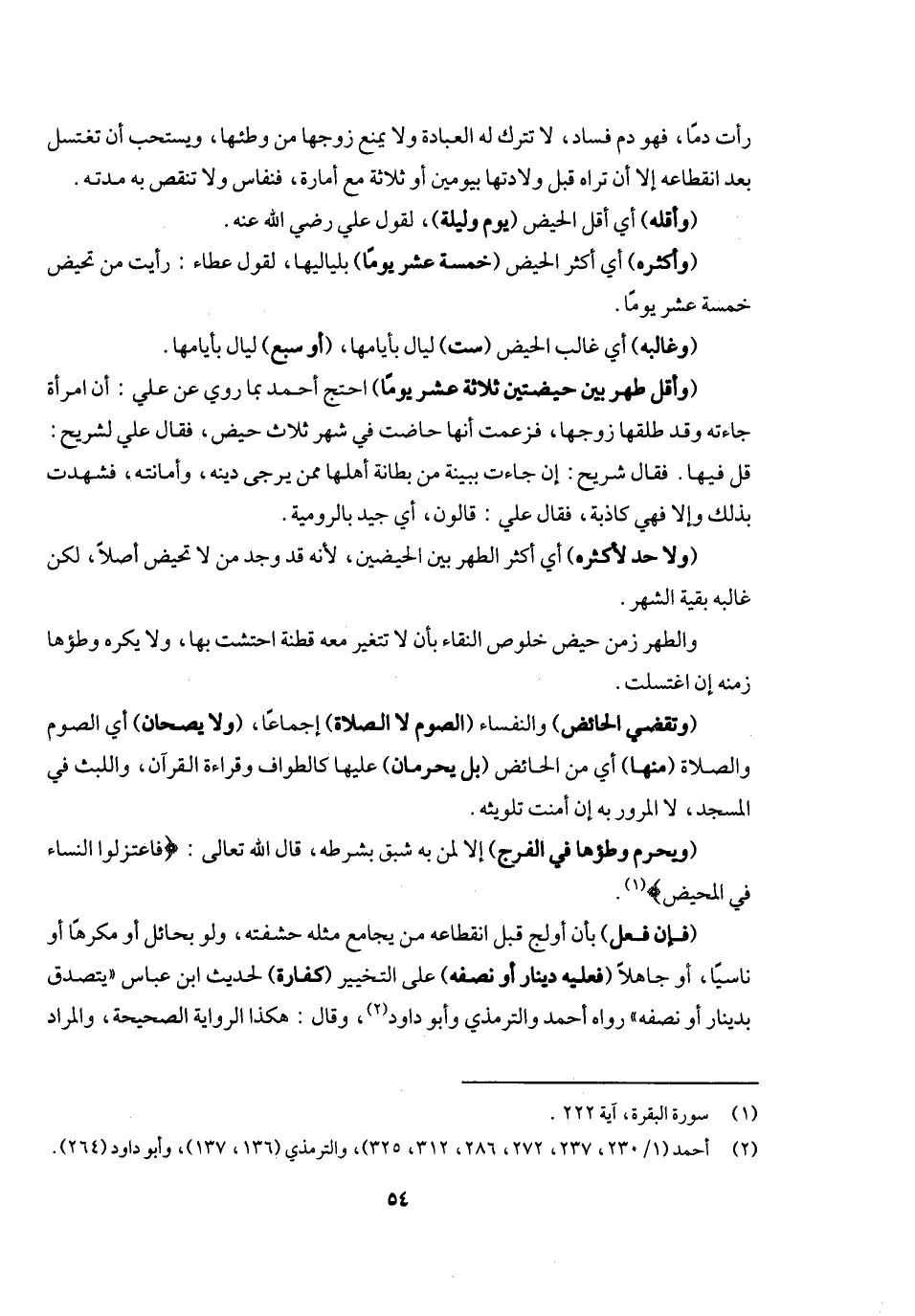 لأنه قد وجد من لا تحيض أصلا، لكن غالبه بقية الشهر، والطهر زمن حيض خلوص النقاء بأن لا تتغير معه قطنة احتشت بها، ولا يكره وطؤها زمنه إن اغتسلت. (وتقضي الحائض) والنفساء] (الصوم لا الصلاة) إجماعا، (ولا يصحان) أي الصوم والصلاة (منها) أي من الحائض (بل يحرمان) عليها كالطواف وقراءة القرآن واللبث في المسجد لا المرور به إن أمنت تلويثه (ويحرم وطؤها في الفرج) إلا لمن به شبق بشرطه، قال الله تعالى: {فَاعْتَزِلُوا النِّسَاءَ فِي الْمَحِيضِ} [البقرة: ٢٢٢] ، (فإن فعل) بأن أولج قبل انقطاعه من يجامع مثله حشفته ولو بحائل أو مكرها أو ناسيا أو جاهلا (فعليه دينار أو نصفه) على التخيير (كفارة) لحديث ابن عباس «يتصدق بدينار أو نصفه» رواه أحمد والترمذي وأبو داود، وقال: هكذا الرواية الصحيحة، والمراد