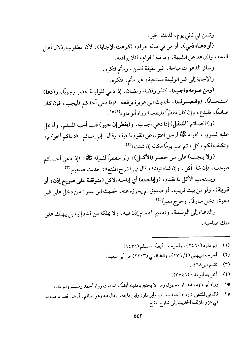 وتسن في ثاني يوم لذلك الخبر، (أو دعاه ذمي) أو من في ماله حرام (كرهت الإجابة) ، لأن المطلوب إذلال أهل الذمة والتباعد عن الشبهة وما فيه الحرام، لئلا يواقعه، وسائر الدعوات مباحة، غير عقيقة فتسن، ومأتم فتكره. والإجابة إلى غير الوليمة مستحبة، غير مأتم فتكره. (ومن صومه واجب) كنذر وقضاء رمضان إذا دعي للوليمة حضر وجوبا، و (دعا) استحبابا (وانصرف) لحديث أبي هريرة يرفعه: «إذ دعي أحدكم فليجب، فإن كان صائما فليدع، وإن كان مفطرا فليطعم» رواه أبو دواد. (و) الصائم (المتنفل) إذا دعي أجاب و (يفطر إن جبر) قلب