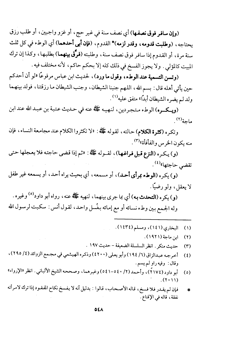 (وتسن التسمية عند الوطء، وقول الوارد) لحديث ابن عباس مرفوعا: «لو أن أحدكم حين يأتي أهله قال: بسم الله، اللهم جنبنا الشيطان وجنب الشيطان ما رزقتنا، فولد بينهما ولد - لم يضره الشيطان أبدا» متفق عليه. (ويكره) الوطء متجردين؛ لنهيه - صَلَّى اللَّهُ عَلَيْهِ وَسَلَّمَ - عنه في حديث عتبة بن عبد الله السلمي عند ابن ماجه. وتكره (كثرة الكلام) حالته؛ لقوله - صَلَّى اللَّهُ عَلَيْهِ وَسَلَّمَ -: «لا تكثروا الكلام عند مجامعة النساء، فإن منه يكون الخرس والفأفأة» . (و) يكره (النزع قبل