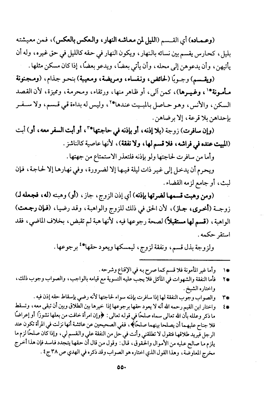 (وعماده) أي: القسم (الليل لمن معاشه النهار، والعكس بالعكس) فمن معيشته بليل كحارس - يقسم بين نسائه بالنهار، ويكون النهار في حقه كالليل في حق غيره، وله أن يأتيهن، وأن يدعوهن إلى محله، وأن يأتي بَعْضًا ويدعو بَعْضًا، إذا كان مسكن مثلها.