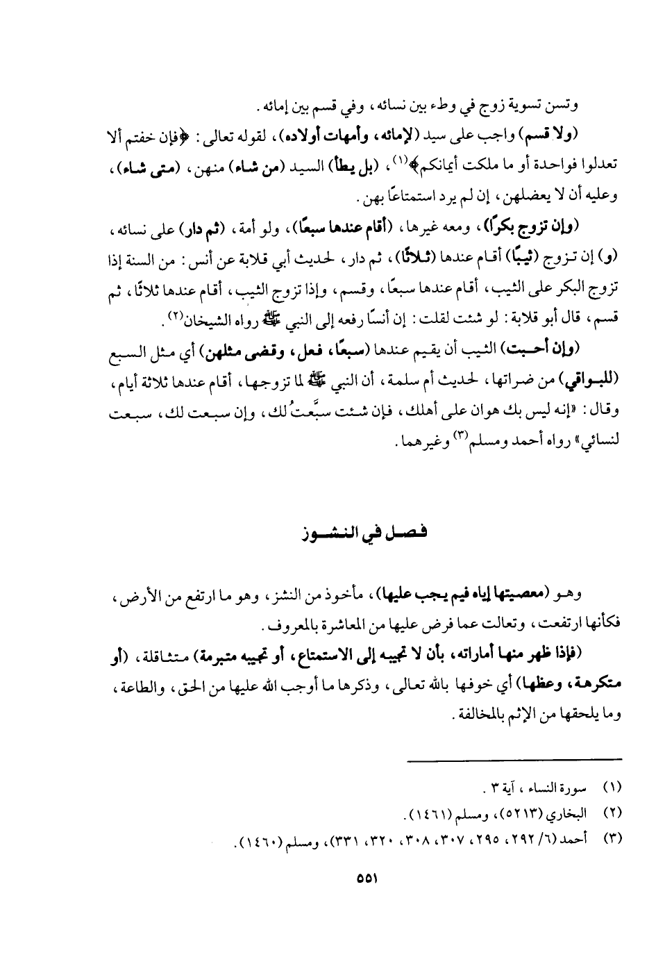 (وإن تزوج بكرا) ومعه غيرها (أقام عندها سبعا) ولو أمة (ثم دار) على نسائه (و) إن تزوج ثيبا) أقام عندها (ثلاثا) ثم دار؛ لحديث أبي قلابة عن أنس: «من السنة إذا تزوج البكر على الثيب أقام عندها سبعا وقسم، وإذا تزوج الثيب أقام عندها ثلاثا ثم قسم» . قال أبو قلابة: لو شئت لقلت: إن أنسا رفعه إلى النبي - صَلَّى اللَّهُ عَلَيْهِ وَسَلَّمَ -. رواه الشيخان. (وإن أحبت) الثيب أن يقيم عندها (سبعا فعل وقضى مثلهن) أي: مثل السبع (للبواقي) من ضراتها؛ لحديث «أم سلمة: أن النبي - صَلَّى اللَّهُ عَلَيْهِ وَسَلَّمَ - لما تزوجها أقام عندها ثلاثة أيام، وقال: " إنه ليس بك هوان على أهلك، فإن شئت سبعت لك، وإن سبعت لك سبعت لنسائي» رواه أحمد ومسلم وغيرهما.