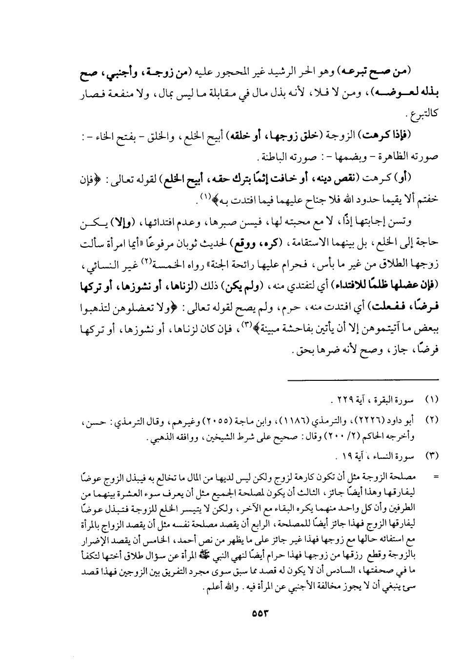 كرهت) الزوجة (خلق زوجها أو خلقه) أبيح الخلع. والخلق بفتح الخاء: صورته الظاهرة، وبضمها: صورته الباطنة (أو) كرهت (نقص دينه أو خافت إثما بترك حقه أبيح الخلع) لِقَوْلِهِ تَعَالَى: {فَإِنْ خِفْتُمْ أَلا يُقِيمَا حُدُودَ اللَّهِ فَلا جُنَاحَ عَلَيْهِمَا فِيمَا افْتَدَتْ بِهِ} [البقرة: ٢٢٩] ، وتسن إجابتها إذا إلا مع محبته لها فيسن صبرها وعدم افتدائها (وإلا) يكن حاجة إلى الخلع، بل بينهما الاستقامة (كره ووقع) لحديث ثوبان مرفوعا: «أيما امرأة سألت زوجها الطلاق من غير ما بأس فحرام عليها رائحة الجنة» رواه الخمسة غير النسائي (فإن عضلها ظلما للافتداء) أي: لتفتدي منه (ولم يكن) ذلك (لزناها أو نشوزها أو تركها فرضا، ففعلت) أي: افتدت منه حرم ولم يصح؛ لِقَوْلِهِ تَعَالَى: {وَلا تَعْضُلُوهُنَّ لِتَذْهَبُوا بِبَعْضِ مَا آتَيْتُمُوهُنَّ إِلا أَنْ يَأْتِينَ بِفَاحِشَةٍ مُبَيِّنَةٍ} [النساء: ١٩] ، فإن كان لزناها أو نشوزها أو تركها فرضا جاز وصح؛ لأنه ضرها بحق