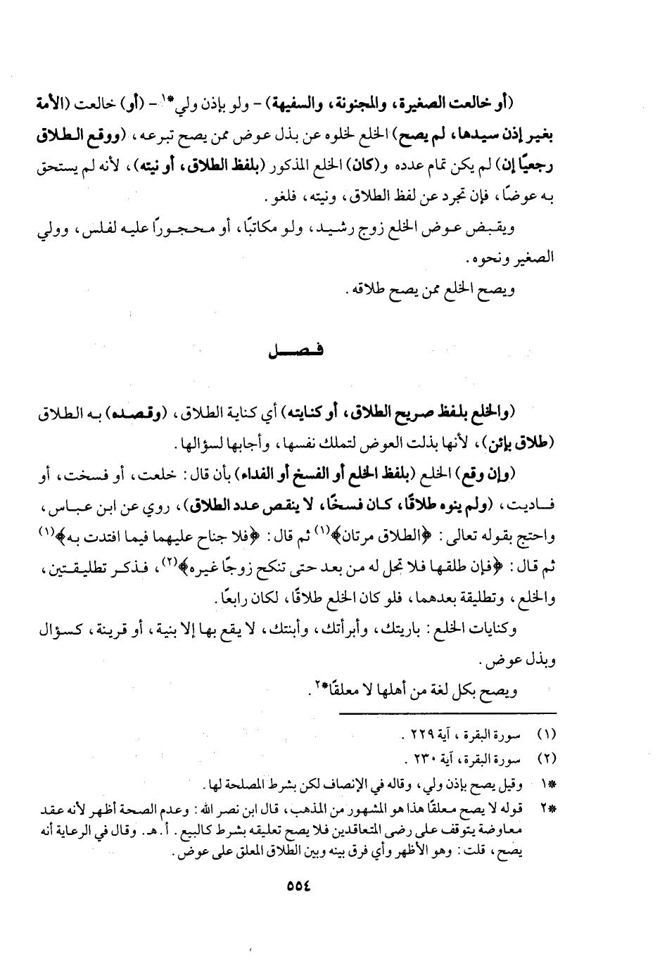 فصل (والخلع بلفظ صريح الطلاق أو كنايته) أي: كناية الطلاق (وقصده) به الطلاق (طلاق بائن) لأنها بذلت العوض لتملك نفسها وأجابها لسؤالها (وإن وقع) الخلع (بلفظ الخلع أو الفسخ أو الفداء) بأن قال خلعت أو فسخت أو فاديت (ولم ينوه طلاقا كان فسخا لا ينقص به عدد الطلاق) روي عن ابن عباس، واحتج بقوله تعالى: {الطَّلاقُ مَرَّتَانِ} [البقرة: ٢٢٩] ، ثم قال: {فَلا جُنَاحَ عَلَيْهِمَا فِيمَا افْتَدَتْ بِهِ} [البقرة: ٢٢٩] ، ثم قال: {فَإِنْ طَلَّقَهَا فَلا تَحِلُّ لَهُ مِنْ بَعْدُ حَتَّى تَنْكِحَ زَوْجًا غَيْرَهُ} [البقرة: ٢٣٠] ، فذكر تطليقتين والخلع وتطليقة بعدهما، فلو كان الخلع طلاقا لكان رابعا، وكنايات الخلع: باريتك وأبرأتك وأبنتك. لا يقع بها إلا بنية أو قرينة كسؤال