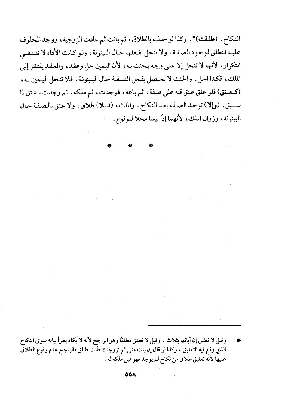 وعقد، والعقد يفتقر إلى الملك فكذا الحل، والحنث لا يحصل بفعل الصفة حال البينونة فلا تنحل اليمين به (كعتق) فلو علق عتق قنه على صفة ثم باعه فوجدت ثم ملكه ثم وجدت عتق لما سبق (وإلا) توجد الصفة بعد النكاح والملك (فلا) طلاق ولا عتق بالصفة حال البينونة وزوال الملك؛ لأنهما إذا ليسا محلا للوقوع.