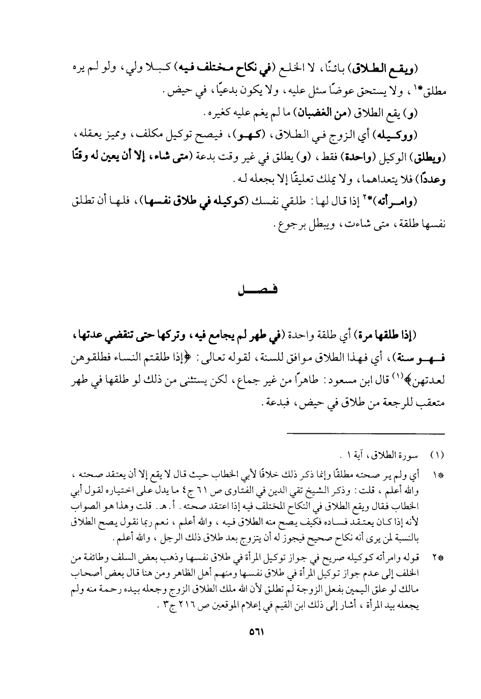 فصل (إذا طلقها مرة) أي: طلقة واحدة (في طهر لم يجامع فيه وتركها حتى تنقضي عدتها فهو سنة) أي: فهذا الطلاق موافق للسنة لِقَوْلِهِ تَعَالَى: {إِذَا طَلَّقْتُمُ النِّسَاءَ فَطَلِّقُوهُنَّ لِعِدَّتِهِنَّ} [الطلاق: ١] ، قال ابن مسعود: طاهرا من غير جماع، لكن يستثنى من ذلك لو طلقها في طهر متعقب للرجعة من طلاق في حيض فبدعة