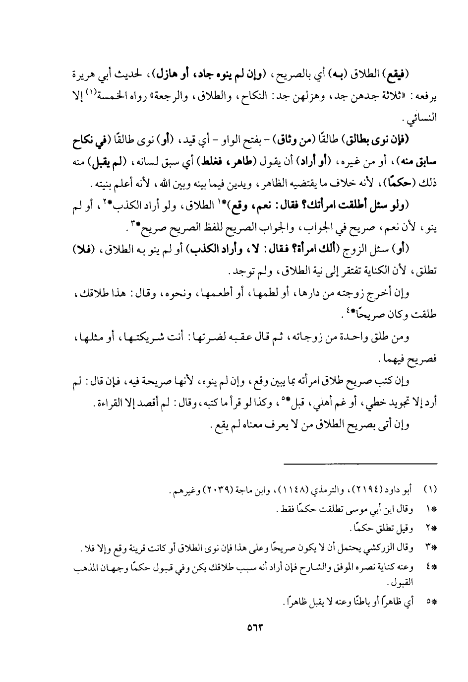 (فيقع) الطلاق (به) أي: بالصريح (وإن لم ينوه جاد وهازل) لحديث أبي هريرة يرفعه: «ثلاثة جدهن جد وهزلهن جد: النكاح والطلاق والرجعة» رواه الخمسة إلا النسائي. (فإن نوى بطالق) طالقا (من وثاق) بفتح الواو، أي: قيد (أو) نوى طالقا (في نكاح سابق منه أو من غيره أو أراد) أن يقول (طاهر فغلط) أي: سبق لسانه (لم يقبل) منه ذلك (حكما) لأنه خلاف ما يقتضيه الظاهر، ويدين فيما بينه وبين الله؛ لأنه أعلم بنيته (ولو سئل: أطلقت امرأتك، فقال: نعم، وقع) الطلاق ولو أراد الكذب أو لم ينو؛ لأن " نعم " صريح في الجواب، والجواب الصريح للفظ الصريح صريح (أو) سئل الزوج (ألك امرأة؟ فقال: لا، وأراد الكذب) أو لم ينو به الطلاق (فلا) تطلق؛ لأنه كناية تفتقر إلى نية الطلاق ولم توجد. وإن أخرج زوجته من دارها أو لطمها أو أطعمها ونحوه، وقال: هذا طلاقك - طلقت، وكان صريحا. ومن طلق واحدة من زوجاته ثم قال عقبه لضرتها أنت شريكتها أو مثلها، فصريح فيهما، وإن كتب صريح طلاق امرأته بما يبين وقع، وإن لم ينوه؛ لأنها صريحة فيه، فإن قال: لم أرد إلا تجويد خطي أو غم أهلي، قبل. وكذا لو قرأ ما كتبه، وقال: لم أقصد إلا القراءة. وإن أتى بصريح الطلاق من لا يعرف معناه - لم يقع.