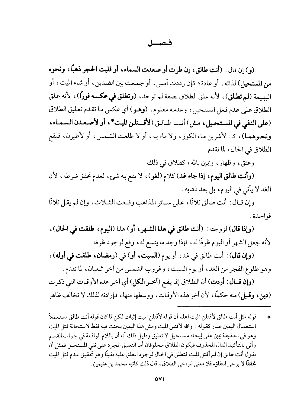 فصل (و) قال (أنت طالق إن طرت أو صعدت السماء أو قلبت الحجر ذهبا ونحوه من المستحيل) لذاته أو عادة كأن رددت أمس أو جمعت بين الضدين أو شاء الميت أو البهيمة (لم تطلق) لأنه علق الطلاق بصفة لم توجد (وتطلق في عكسه فورا) لأنه علق الطلاق على عدم فعل المستحيل، وعدمه معلوم (وهو) أي: عكس ما تقدم تعليق الطلاق (على النفي في المستحيل مثل) أنت طالق (لأقتلن الميت أو لأصعدن السماء ونحوهما) كـ: لأشربن ماء الكوز ولا ماء به أو لأطلعن الشمس أو لأطيرن، فيقع الطلاق في الحال لما تقدم، وعتق وظهار ويمين بالله كطلاق في ذلك (وأنت طالق اليوم إذا جاء غد) كلام (لغو) لا يقع به شيء لعدم تحقق شرطه؛ لأن الغد لا يأتي في اليوم بل يأتي بعد ذهابه وإن قال أنت طالق ثلاثا على سائر المذاهب وقعت الثلاث، وإن لم يقل ثلاثا فواحدة (وإذا قال) لزوجته (أنت طالق في هذا الشهر أو) هذا (اليوم طلقت في الحال) لأنه جعل الشهر أو اليوم ظرفا له، فإذا وجد ما يتسع له وقع لوجود ظرفه (وإن قال) أنت طالق في (غد أو) يوم (السبت أو) في (رمضان طلقت في أوله) وهو طلوع الفجر من الغد أو يوم السبت وغروب الشمس من آخر شعبان لما تقدم (وإن قال: أردت) أن الطلاق إنما يقع (آخر الكل) أي: آخر هذه الأوقات التي ذكرت (دين، وقبل) منه حكما؛ لأن آخر هذه الأوقات ووسطها منها