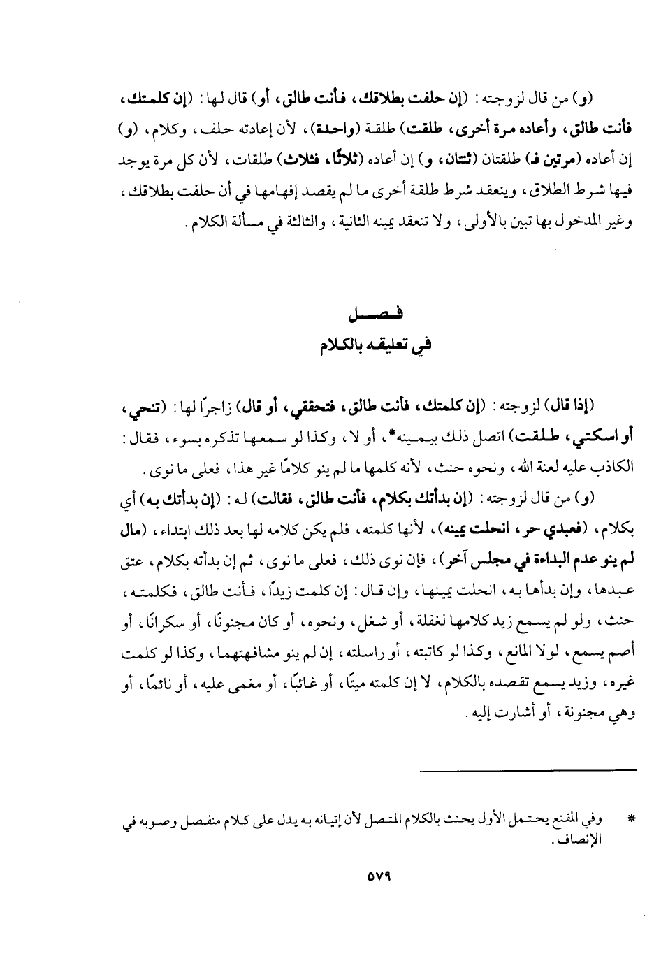 طلقت) اتصل ذلك بيمينه أو لا وكذا لو سمعها تذكره بسوء، فقال: الكاذب عليه لعنة الله ونحوه -[حنث] ؛ لأنه كلمها ما لم ينو كلاما غير هذا، فعلى ما ينوي. (و) من قال لزوجته (إن بدأتك بكلام فأنت طالق فقالت) له (إن بدأتك به) أي: بكلام (فعبدي حر انحلت يمينه) لأنها كلمته [أولا] فلم يكن كلامه لها بعد ذلك ابتداء (ما لم ينو عدم البداءة في مجلس آخر) فإن نوى ذلك فعلى ما نوى، ثم إن بدأته بكلام عتق عبدها، وإن بدأها به انحلت يمينها، وإن قال إن كلمت زيدا فأنت طالق فكلمته حنث ولو لم يسمع زيد كلامها لغفلة أو شغل ونحوه أو كان مجنونا أو سكرانا أو أصم يسمع لولا المانع، وكذا لو كاتبته أو راسلته إن لم ينو مشافهتها وكذا لو كلمت غيره وزيد يسمع تقصده بالكلام، لا إن كلمته ميتا أو غائبا أو مغمى عليه أو نائما أو وهي مجنونة أو أشارت إليه.
