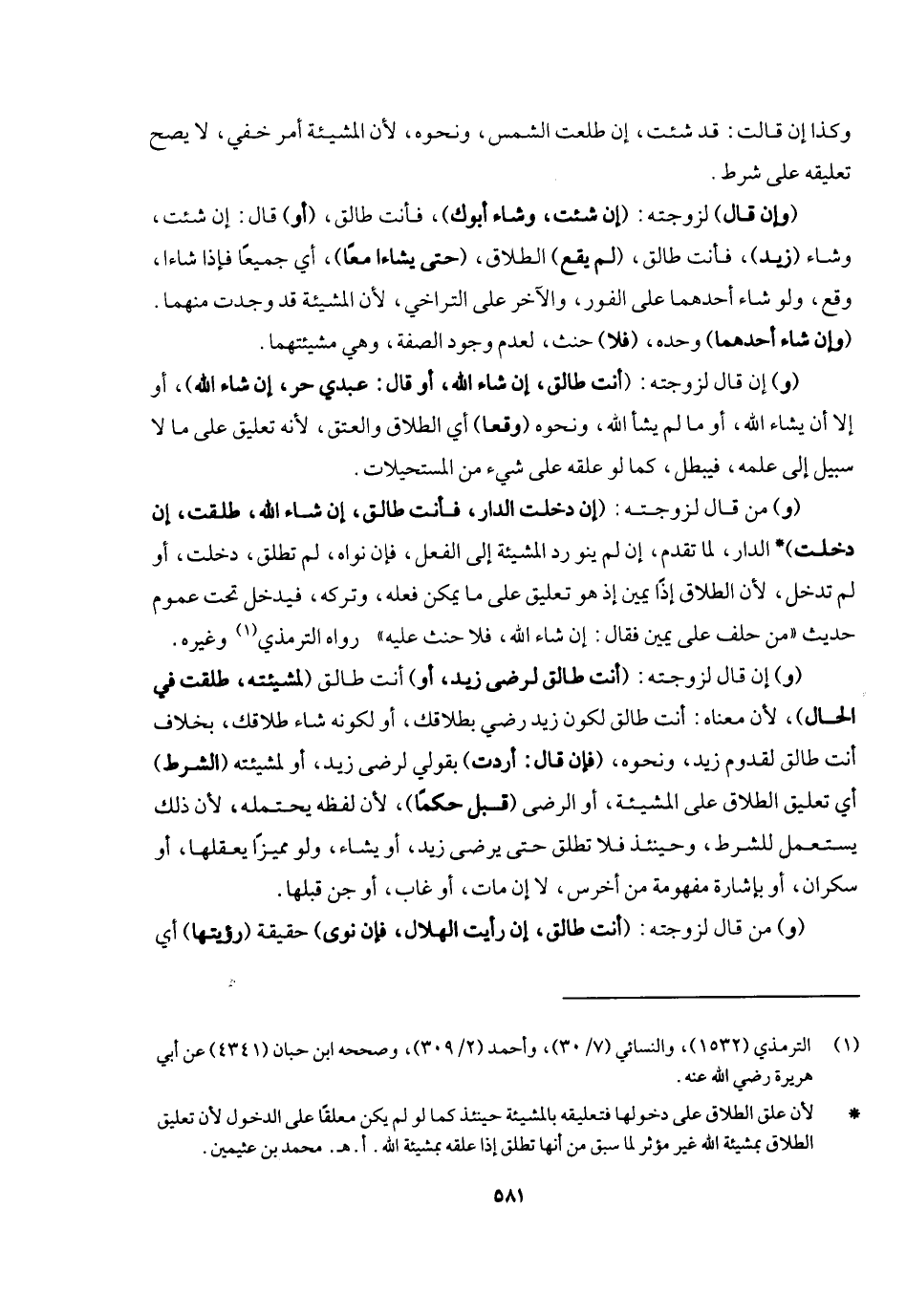 وكذا إن قالت قد شئت إن طلعت الشمس ونحوه؛ لأن المشيئة أمر خفي لا يصح تعليقه على شرط (وإن قال) لزوجته (إن شئت وشاء أبوك) فأنت طالق (أو) قال إن شئت وشاء (زيد) فأنت طالق (لم يقع) الطلاق (حتى يشاءا معا) أي: جميعا، فإذا شاءا وقع، لو شاء أحدهما على الفور، والآخر على التراخي؛ لأن المشيئة قد وجدت منهما (وإن شاء أحدهما) وحده (فلا) حنث لعدم وجود الصفة وهي مشيئتهما (و) إن قال لزوجته (أنت طالق إن شاء الله أو قال عبدي حر إن شاء الله) أو إلا أن يشاء الله، أو ما لم يشأ الله ونحوه (وقعا) أي: الطلاق والعتق؛ لأنه تعليق على ما لا سبيل إلى علمه، فيبطل كما لو علقه على شيء من المستحيلات.