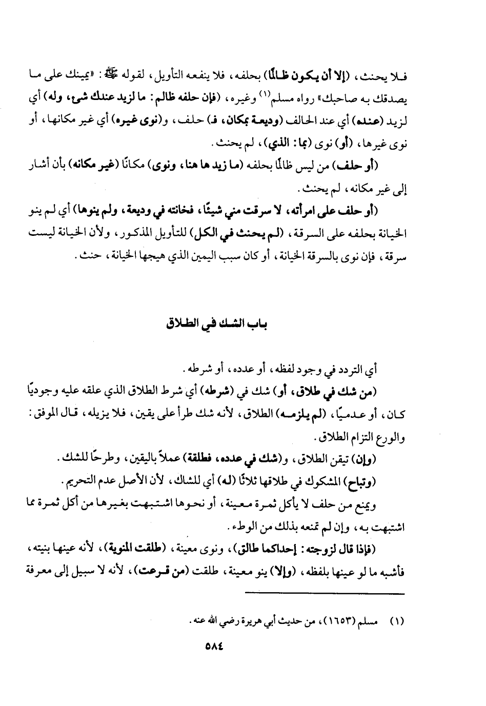 أي: التردد في وجود لفظه أو عدده أو شرطه (من شك في طلاق أو) شك في (شرطه) أي: شرط الطلاق الذي علق عليه وجوديا كان أو عدميا (لم يلزمه) الطلاق؛ لأنه شك طرأ على يقين فلا يزيله، قال الموفق: والورع التزام الطلاق (وإن) تيقن الطلاق و (شك في عدده فطلقة) عملا باليقين وطرحا للشك (وتباح) المشكوك في طلاقها ثلاثا (له) أي: للشاك؛ لأن الأصل عدم التحريم ويمنع من حلف لا يأكل ثمرة معينة أو نحوها اشتبهت بغيرها من أكل ثمرة مما اشتبهت به وإن لم تمنعه بذلك من الوطء (فإذا قال لامرأتيه إحداكما طالق) ونوى معينة (طلقت المنوية) لأنه عينها بنيته فأشبه ما لو عينها بلفظه (وإلا) ينو معينة طلقت (من قرعت) لأنه لا سبيل إلى معرفة