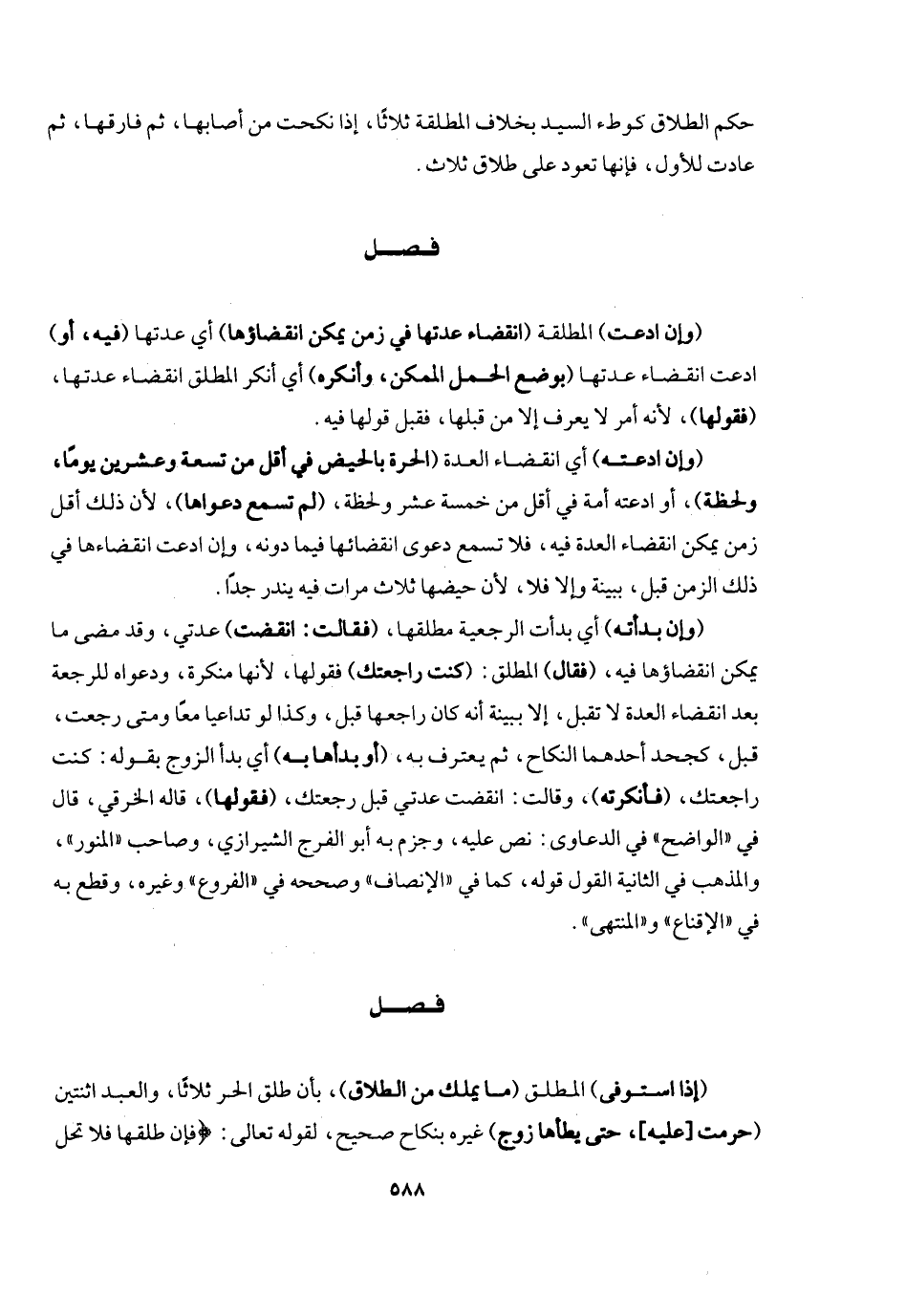فصل (وإن ادعت) المطلقة (انقضاء عدتها في زمن يمكن انقضاؤها) أي: عدتها (فيه أو) ادعت انقضاء عدتها (بوضع الحمل الممكن وأنكره) أي: أنكر المطلق انقضاء عدتها (فقولها) لأنه أمر لا يعرف إلا من قبلها فقبل قولها فيه (وإن ادعته) أي: انقضاء العدة (الحرة بالحيض في أقل من تسعة وعشرين يوما ولحظة) أو ادعته أمة في أقل من خمسة عشر ولحظة (لم تسمع دعواها) لأن ذلك أقل زمن يمكن انقضاء العدة فيه فلا تسمع دعوى انقضائها فيما دونه وإن ادعت انقضاءها في ذلك الزمن قبل، ببينة وإلا فلا؛ لأن حيضها ثلاث مرات فيه يندر جدا (وإن بدأته) أي: بدأت الرجعية مطلقها (فقالت انقضت) عدتي وقد مضى ما يمكن انقضاؤها فيه (فقال) المطلق (كنت راجعتك) فقولها؛ لأنها منكرة ودعواه للرجعة بعد انقضاء العدة لا تقبل إلا ببينة أنه كان راجعها قبل وكذا لو تداعيا معا متى رجعت قبل كجحد أحدهما النكاح ثم يعترف به (أو بدأها به) أي: بدأ الزوج بقوله كنت راجعتك (فأنكرته) وقالت انقضت عدتي قبل رجعتك (فقولها) قاله الخرقي، قال في الواضح في الدعاوي: نص عليه، وجزم به أبو الفرج الشيرازي وصاحب " المنور "، والمذهب في الثانية القول قوله كما في " الإنصاف " وصححه في " الفروع " وغيره، وقطع به في " الإقناع " و " المنتهى ".
