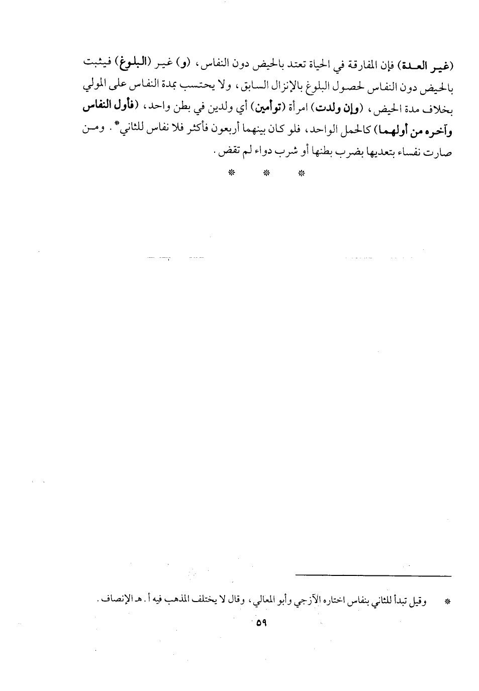 (غير العدة) فإن المفارقة في الحياة تعتد بالحيض دون النفاس، (و) غير (البلوغ) فيثبت بالحيض دون النفاس لحصول البلوغ بالإنزال السابق للحمل، ولا يحتسب بمدة النفاس على المولى بخلاف مدة الحيض، (وإن ولدت) امرأة (توأمين) أي ولدين في بطن واحد (فأول النفاس وآخره من أولهما) كالحمل الواحد، فلو كان بينهما أربعون يوما فأكثر فلا نفاس للثاني. ومن صارت نفساء بتعديها بضرب بطنها أو بشرب دواء لم تقض.