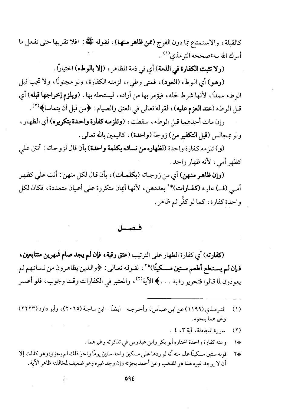 فصل (وكفارته) أي: كفارة الظهار على الترتيب (عتق رقبة فإن لم يجد صام شهرين متتابعين فإن لم يستطع أطعم ستين مسكينا) لِقَوْلِهِ تَعَالَى: {وَالَّذِينَ يُظَاهِرُونَ مِنْ نِسَائِهِمْ ثُمَّ يَعُودُونَ لِمَا قَالُوا فَتَحْرِيرُ رَقَبَةٍ} [المجادلة: ٣] . . . الآية، والمعتبر في الكفارات وقت وجوب، فلو أعسر