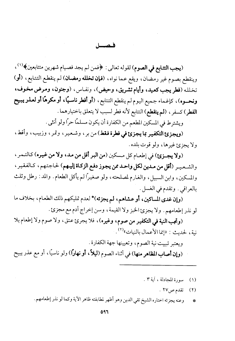 فصل (يجب التتابع في الصوم) لِقَوْلِهِ تَعَالَى: {فَمَنْ لَمْ يَجِدْ فَصِيَامُ شَهْرَيْنِ مُتَتَابِعَيْنِ} [المجادلة: ٤] ، وينقطع بصوم غير رمضان، ويقع عما نواه (فإن تخلله رمضان) لم ينقطع التتابع (أو) تخلله (فطر يجب كعيد وأيام تشريق وحيض) ونفاس (وجنون ومرض مخوف ونحوه) كإغماء جميع اليوم لم ينقطع التتابع (أو أفطر ناسيا أو مكرها أو لعذر يبيح الفطر) كسفر (لم ينقطع) التتابع؛ لأنه فطر لسبب لا يتعلق باختيارهما. ويشترط في المسكين المطعم من الكفارة أن يكون مسلما حرا ولو أنثى.