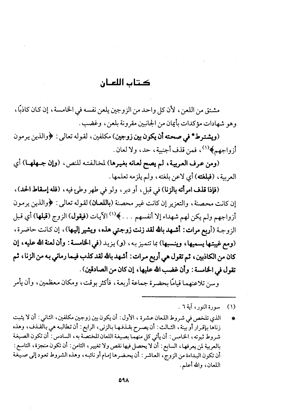 (ويشترط في صحته أن يكون بين زوجين) مكلفين؛ لِقَوْلِهِ تَعَالَى: {وَالَّذِينَ يَرْمُونَ أَزْوَاجَهُمْ} [النور: ٦] ، فمن قذف أجنبية حد ولا لعان (ومن عرف العربية لم يصح لعانه بغيرها) لمخالفته للنص (وإن جهلها) أي: العربية (فبلغته) أي: لاعن بلغته ولم يلزمه تعلمها (فإذا قذف امرأته بالزنا) في قبل أو دبر ولو في طهر وطئ فيه (فله إسقاط الحد) إن كانت محصنة، [والتعزير إن كانت غير محصنة] (باللعان) لِقَوْلِهِ تَعَالَى: {وَالَّذِينَ يَرْمُونَ أَزْوَاجَهُمْ وَلَمْ يَكُنْ لَهُمْ شُهَدَاءُ إِلا أَنْفُسُهُمْ} [النور: ٦] . . . الآيات (فيقول) الزوج (قبلها) أي: قبل الزوجة (أربع مرات: أشهد بالله لقد زنت زوجتي هذه، ويشير إليها) إن كانت حاضرة (ومع غيبتها يسميها وينسبها) بما تتميز به (و) يزيد (في الخامسة: وأن لعنة الله عليه إن كان من الكاذبين، ثم تقول هي أربع مرات: أشهد بالله لقد كذب فيما رماني به من الزنا، ثم تقول في الخامسة: وأن غضب الله عليها إن كان من الصادقين) وسن تلاعنهما قياما بحضرة جماعة أربعة فأكثر بوقت ومكان معظمين وأن يأمر