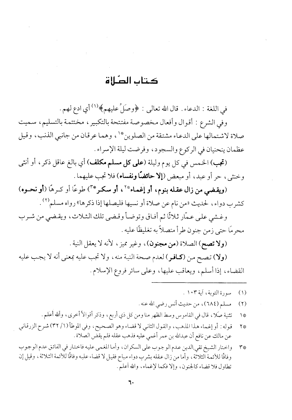 [الصلاة] في اللغة: الدعاء. قال الله تعالى: {وَصَلِّ عَلَيْهِمْ} [التوبة: ١٠٣] أي ادع لهم، وفي الشرع: أقوال وأفعال مخصوصة مفتتحة بالتكبير مختتمة بالتسليم، سميت صلاة لاشتمالها على الدعاء مشتقة من الصلوين وهما عرقان من جانبي الذنب وقيل: عظمان ينحنيان في الركوع والسجود، وفرضت ليلة الإسراء.