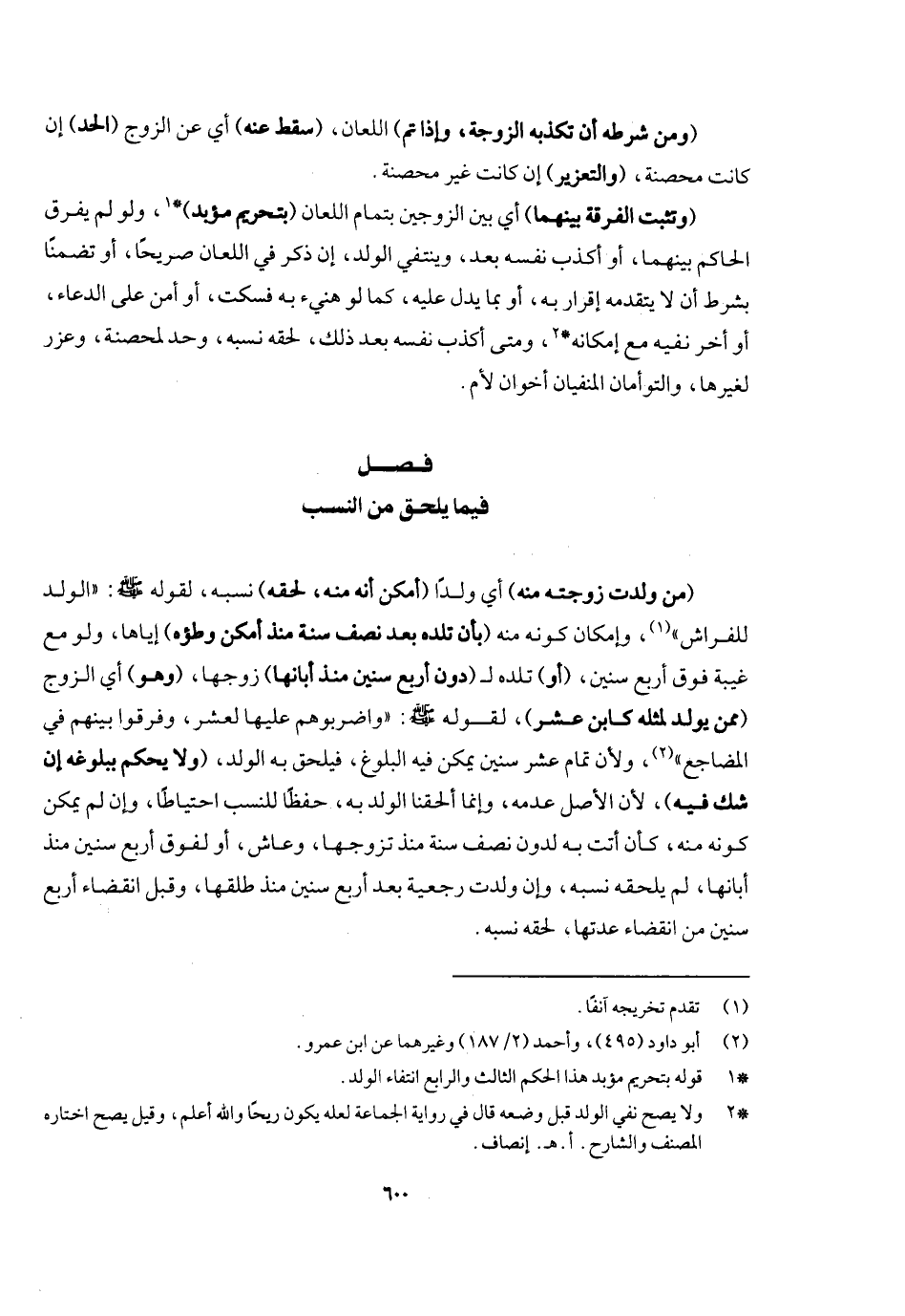 إن شك فيه) لأن الأصل عدمه وإنما ألحقنا الولد به حفظا للنسب احتياطا، وإن لم يمكن كونه منه كأن أتت به لدون نصف سنة منذ تزوجها وعاش أو لفوق أربع سنين منذ أبانها لم يلحقه نسبه، وإن ولدت رجعية بعد أربع سنين منذ طلقها وقبل انقضاء أربع سنين من انقضاء عدتها لحقه نسبه.
