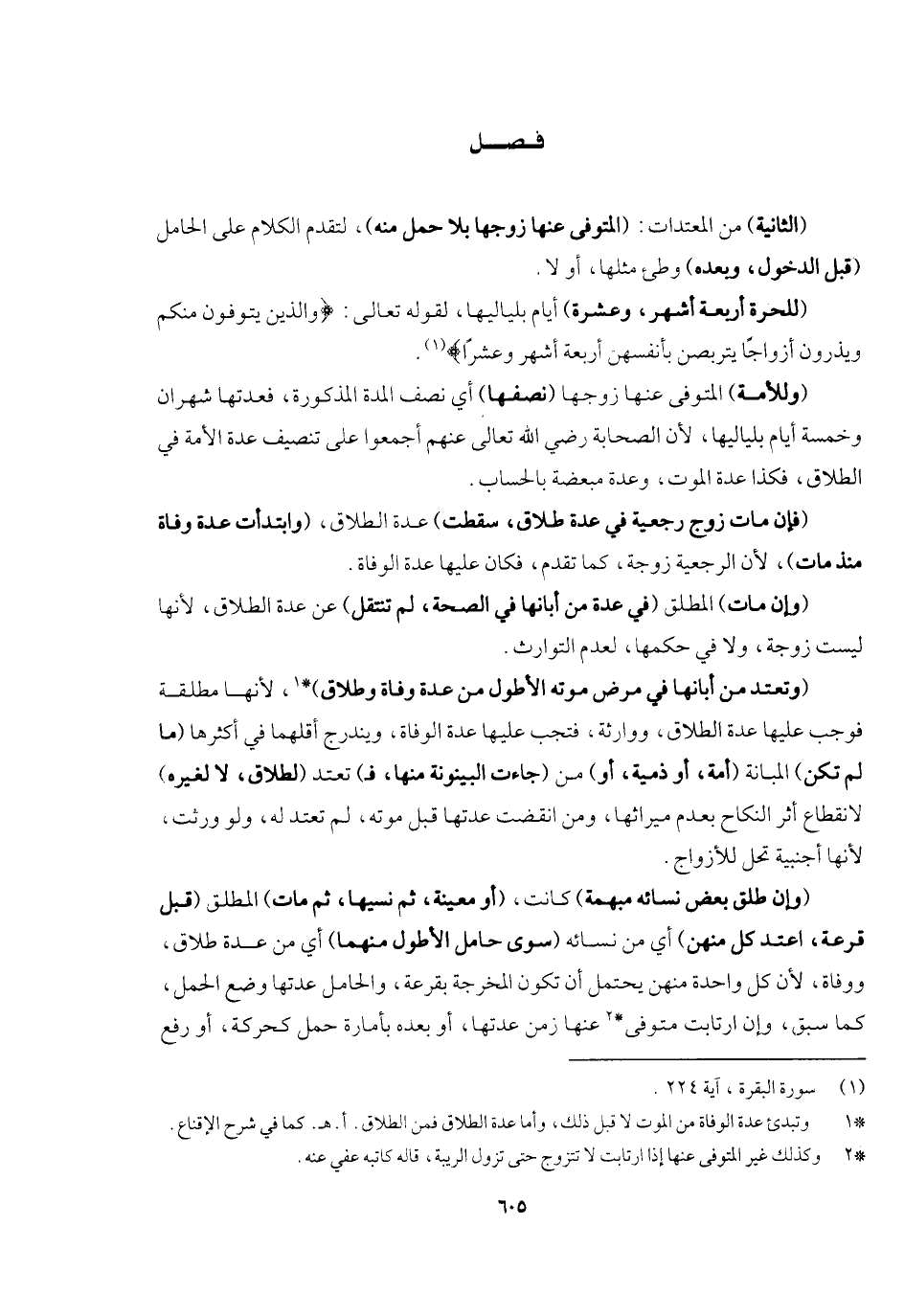 فصل (الثانية) من المعتدات (المتوفى عنها زوجها بلا حمل منه) لتقدم الكلام على الحامل (قبل الدخول وبعده) وطئ مثلها أو لا (للحرة أربعة أشهر وعشرة) أيام بلياليها؛ لِقَوْلِهِ تَعَالَى: {وَالَّذِينَ يُتَوَفَّوْنَ مِنْكُمْ وَيَذَرُونَ أَزْوَاجًا يَتَرَبَّصْنَ بِأَنْفُسِهِنَّ أَرْبَعَةَ أَشْهُرٍ وَعَشْرًا} [البقرة: ٢٣٤] ، (وللأمة) المتوفى عنها زوجها (نصفها) أي: نصف المدة المذكورة، فعدتها شهران وخمسة أيام بلياليها؛ لأن الصحابة - رَضِيَ اللَّهُ تَعَالَى عَنْهُمْ - أجمعوا على تنصيف عدة الأمة في الطلاق، فكذا عدة الموت، وعدة مبعضة بالحساب (فإن مات زوج رجعية في عدة طلاق سقطت) عده الطلاق (وابتدأت عدة وفاة منذ مات) لأن الرجعية زوجة كما تقدم، فكان عليها عدة الوفاة (وإن مات) المطلق (في عدة من أبانها في الصحة لم تنتقل) عن عدة الطلاق؛ لأنها ليست زوجة ولا في حكمها لعدم التوارث (وتعتد من أبانها في مرض موته الأطول من عدة وفاة وطلاق) لأنها مطلقة فوجبت عليها عدة الطلاق، ووارثة فتجب عليها عدة الوفاة ويندرج أقلهما في أكثرهما (ما لم تكن) المبانة (أمة أو ذمية أو) من (جاءت