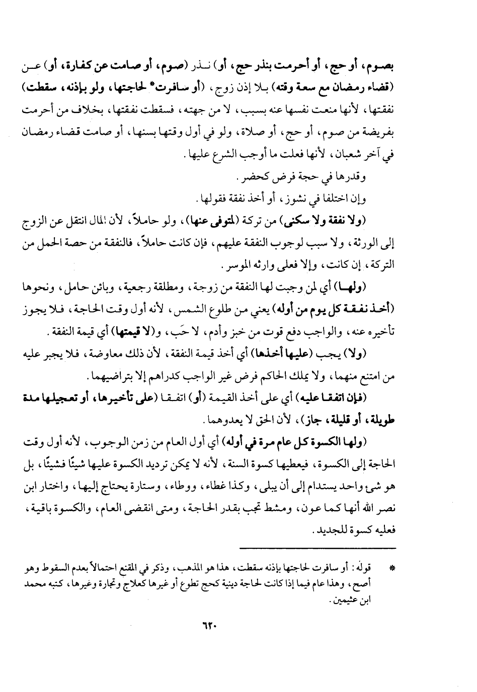 بصوم أو حج أو أحرمت بنذر حج أو) نذر (صوم أو صامت عن كفارة أو) عن (قضاء رمضان مع سعة وقته) بلا إذن زوج (أو سافرت لحاجتها ولو بإذنه سقطت) نفقتها؛ لأنها منعت نفسها عنه بسبب لا من جهته فسقطت نفقتها بخلاف من أحرمت بفريضة من صوم أو حج أو صلاة ولو في أول وقتها بسنتها أو صامت قضاء رمضان في آخر شعبان؛ لأنها فعلت ما أوجب الشرع عليها وقدرها في حجة فرض كحضر وإن اختلفا في نشوز أو أخذ نفقة فقولها (ولا نفقة ولا سكنى) من تركة (لمتوفى عنها) ولو حاملا؛ لأن المال انتقل عن الزوج إلى الورثة، ولا سبب لوجوب النفقة عليهم، فإن كانت حاملا فالنفقة من حصة الحمل من التركة إن كانت، وإلا فعلى وارثه الموسر.
