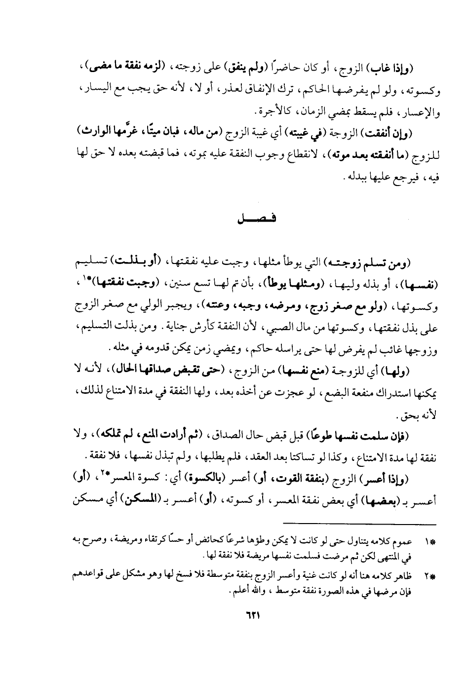 فصل (ومن تسلم زوجته) التي يوطأ مثلها وجبت عليه نفقتها (أو بذلت) تسليم (نفسها) أو بذله وليها (ومثلها يوطأ) بأن تم لها تسع سنين (وجبت نفقتها) وكسوتها (ولو مع صغر زوج ومرضه وجبه وعنته) ويجبر الولي مع صغر الزوج على بذل نفقتها وكسوتها من مال الصبي؛ لأن النفقه كأرش جناية. ومن بذلت التسليم وزوجها غائب لم يفرض لها حتى يراسله حاكم، ويمضي زمن يمكن قدومه في مثله.