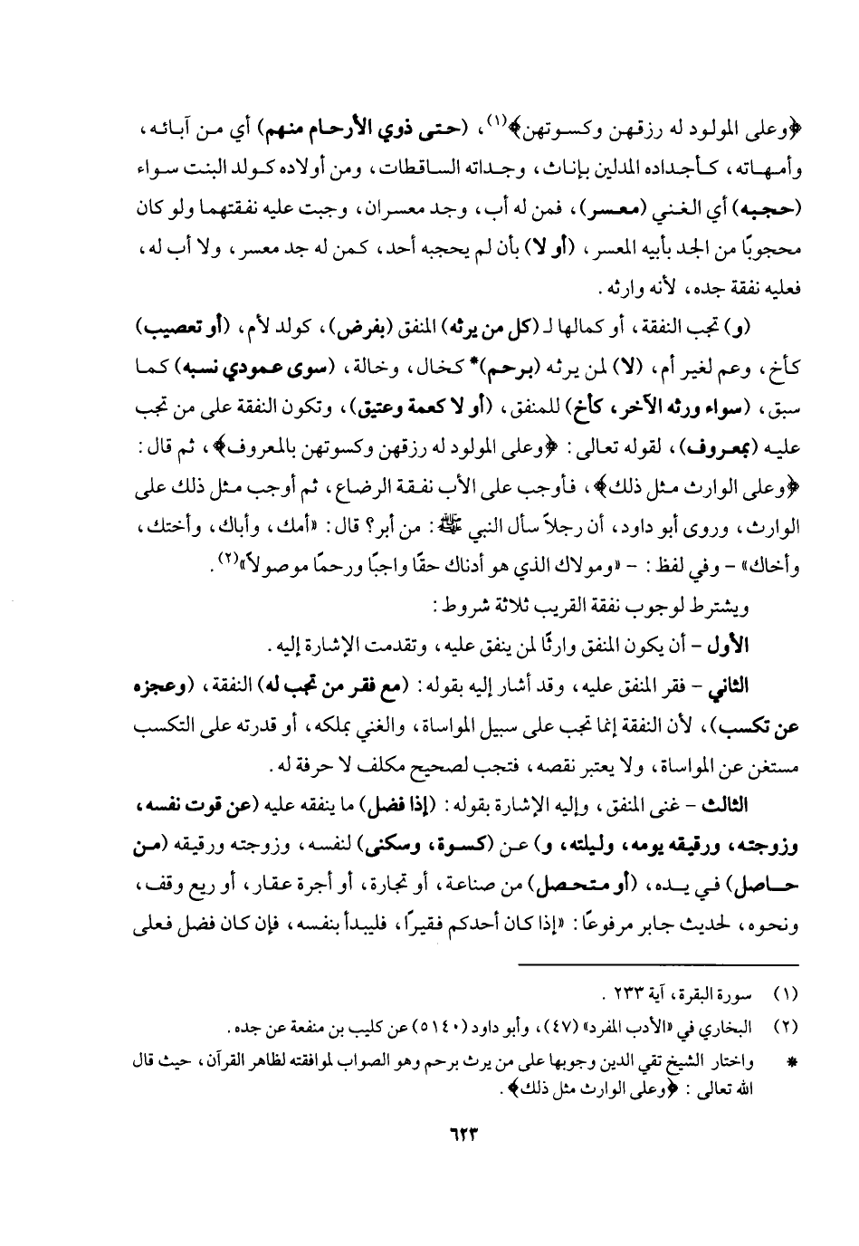 {وَعَلَى الْمَوْلُودِ لَهُ رِزْقُهُنَّ وَكِسْوَتُهُنَّ} [البقرة: ٢٣٣] ، (حتى ذوي الأرحام منهم) أي: من آبائه وأمهاته، كأجداده المدلين بإناث وجداته الساقطات، ومن أولاده كولد البنت سواء (حجبه) أي الغني (معسر) فمن له أب وجد معسران وجبت عليه نفقتهما ولو كان محجوبا من الجد بأبيه المعسر (أو لا) بأن لم يحجبه أحد، كمن له جد معسر ولا أب له، فعليه نفقة جده؛ لأنه وارثه.
