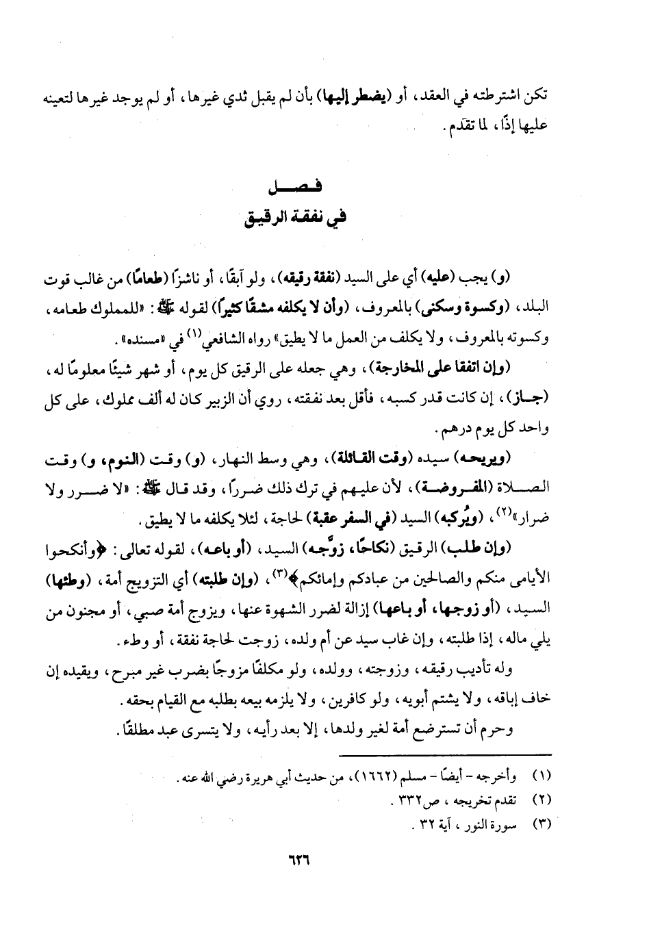 (و) يجب (عليه) أي: على السيد (نفقة رقيقه) ولو آبقا أو ناشزا (طعاما) من غالب قوت البلد (وكسوة وسكنى) بالمعروف (وأن لا يكلفه مشقا كثيرا) لقوله - صَلَّى اللَّهُ عَلَيْهِ وَسَلَّمَ -: «للمملوك طعامه وكسوته بالمعروف، ولا يكلف من العمل ما لا يطيق» رواه الشافعي في " مسنده ". (وإن اتفقا على المخارجة) وهي جعله على الرقيق كل يوم أو كل شهر شيئا معلوما له (جاز)