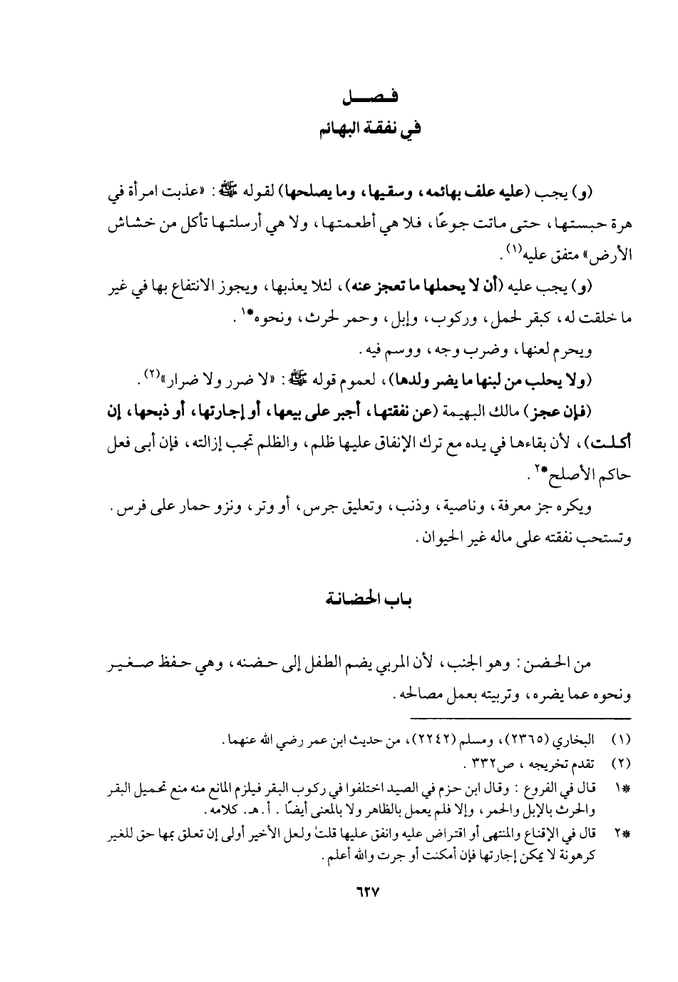 في نفقة البهائم (و) يجب (عليه علف بهائمه وسقيها وما يصلحها) لقوله - صَلَّى اللَّهُ عَلَيْهِ وَسَلَّمَ -: «عذبت امرأة في هرة حبستها حتى ماتت جوعا، فلا هي أطعمتها ولا هي أرسلتها تأكل من خشاش الأرض» متفق عليه. (و) يجب عليه (أن لا يحملها ما تعجز عنه) لئلا يعذبها، ويجوز الانتفاع بها في غير ما خلقت له كبقر لحمل وركوب وإبل وحمر لحرث ونحوه، ويحرم لعنها وضرب وجه ووسم فيه (ولا يحلب من لبنها ما يضر ولدها) لعموم قوله - صَلَّى اللَّهُ عَلَيْهِ وَسَلَّمَ -: «لا ضرر ولا ضرار» ، (فإن عجز) مالك البهيمة (عن نفقتها أجبر على بيعها أو إجارتها أو ذبحها إن أكلت) لأن بقاءها في يده مع ترك الإنفاق عليها ظلم، والظلم تجب إزالته، فإن أبى فعل حاكم الأصلح. ويكره جز معرفة وناصية وذنب وتعليق جرس أو وتر ونزو حمار على فرس، وتستحب نفقته على ماله غير الحيوان.