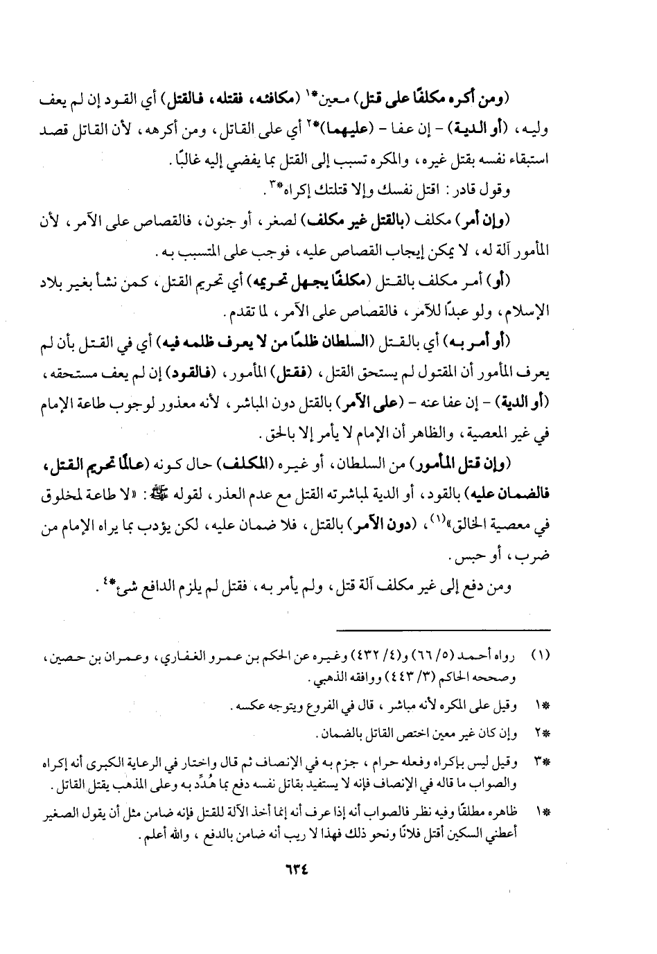 (ومن أكره مكلفا على قتل) معين (مكافئه فقتله، بالقتل) أي: القود إن لم يعف وليه (أو الدية) إن عفا (عليهما) أي: على القاتل ومن أكرهه؛ لأن القاتل قصد استبقاء نفسه بقتل غيره، والمكره تسبب إلى القتل بما يفضي إليه غالبا، وقول قادر: اقتل نفسك وإلا قتلتك إكراه (وإن أمر) مكلف (بالقتل غير مكلف) لصغر أو جنون، فالقصاص على الآمر؛ لأن المأمور آلة له، لا يمكن إيجاب القصاص عليه فوجب على المتسبب به (أو) أمر مكلف بالقتل (مكلفا يجهل تحريمه) أي: تحريم القتل كمن نشأ بغير بلاد الإسلام ولو عبدا للآمر، فالقصاص على الآمر لما تقدم (أو أمر به) أي: بالقتل (السلطان ظلما من لا يعرف ظلمه فيه) أي: في القتل بأن لم يعرف المأمور أن المقتول لم يستحق القتل (فقتل) المأمور (فالقود) إن لم يعف مستحقه (أو الدية) إن عفا عنه (على الآمر) بالقتل دون المباشر؛ لأنه معذور لوجوب طاعة الإمام في غير المعصية، والظاهر أن الإمام لا يأمر إلا بالحق.