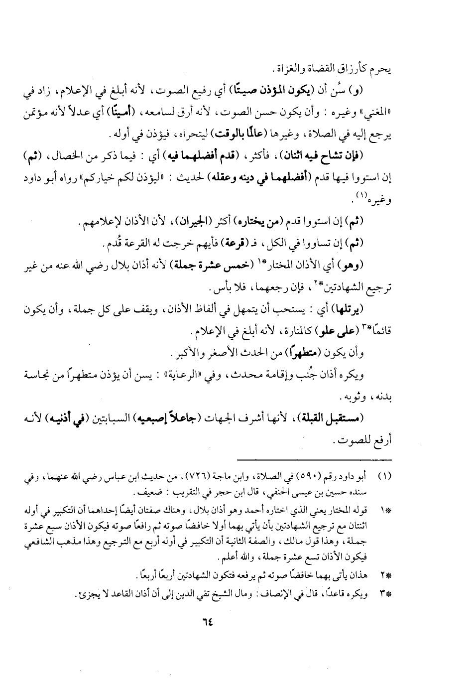 (و) سن أن (يكون المؤذن صيتا) أي رفيع الصوت؛ لأنه أبلغ في الإعلام، زاد في " المغني " وغيره: وأن يكون حسن الصوت؛ لأنه أرق لسامعه (أمينا) أي عدلا مؤتمن يرجع إليه في الصلاة وغيرها (عالما بالوقت) ليتحراه فيؤذن في أوله.