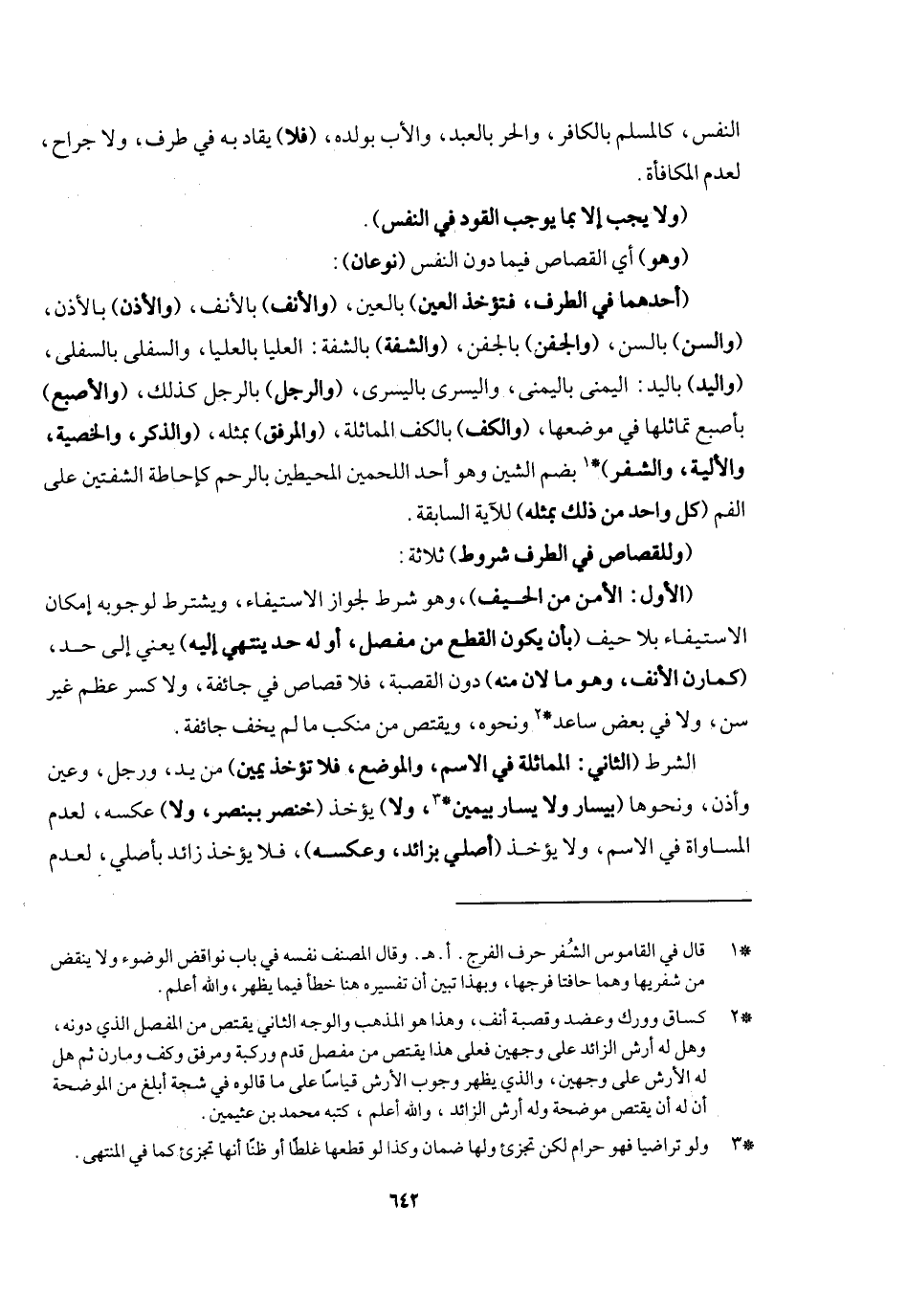 (وللقصاص في الطرف شروط) ثلاثة (الأول: الأمن من الحيف) وهو شرط جواز الاستيفاء، ويشترط لوجوبه إمكان الاستيفاء بلا حيف، (بأن يكون القطع من مفصل أو ينتهي إليه) يعني إلى حد (كمارن الأنف وهو ما لان منه) دون القصبة، فلا قصاص في جائفة ولا كسر عظم غير سن ولا بعض ساعد ونحوه، ويقتص من منكب ما لم يخف جائفة.
