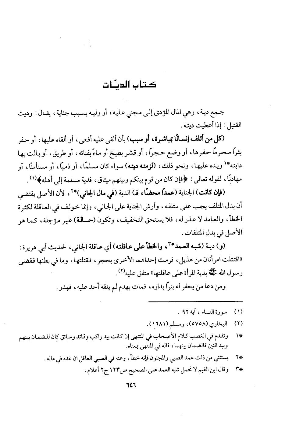 جمع دية، وهي المال المؤدى إلى مجني عليه، أو وليه بسبب جناية، يقال: وديت القتيل: إذا أعطيت ديته. (كل من أتلف إنسانا بمباشرة أو سبب) بأن ألقى عليه أفعى، أو ألقاه عليها، أو حفر بئرا محرما حفرها، أو وضع حجرا، أو قشر بطيخ، أو ماء بفنائه، أو طريق، أو بالت بها دابته ويده عليها ونحو ذلك، (لزمته ديته) سواء كان مسلما، أو ذميا، أو مستأمنا، أو مهادنا؛ لِقَوْلِهِ تَعَالَى: {وَإِنْ كَانَ مِنْ قَوْمٍ بَيْنَكُمْ وَبَيْنَهُمْ مِيثَاقٌ فَدِيَةٌ مُسَلَّمَةٌ إِلَى أَهْلِهِ} [النساء: ٩٢] ، (فإن كانت) الجناية (عمدا محضا فـ) الدية (في مال الجاني) ، لأن الأصل يقتضي أن بدل المتلف يجب على متلفه وأرش الجناية على الجاني، وإنما خولف في العاقلة لكثرة الخطأ، والعامد لا عذر له فلا يستحق التخفيف، وتكون (حالة) غير مؤجلة كما هو الأصل في بدل المتلفات. (و) دية (شبه العمد والخطأ على عاقلته) أي عاقلة الجاني، لحديث أبي هريرة: «اقتتلت امرأتان من هذيل فرمت إحداهما الأخرى بحجر فقتلتها وما في بطنها فقضى رسول الله - صَلَّى اللَّهُ عَلَيْهِ وَسَلَّمَ - بدية المرأة على عاقلتها» متفق عليه، ومن دعا من يحفر له بئرا بداره فمات بهدم لم يلقه أحد عليه فهدر.
