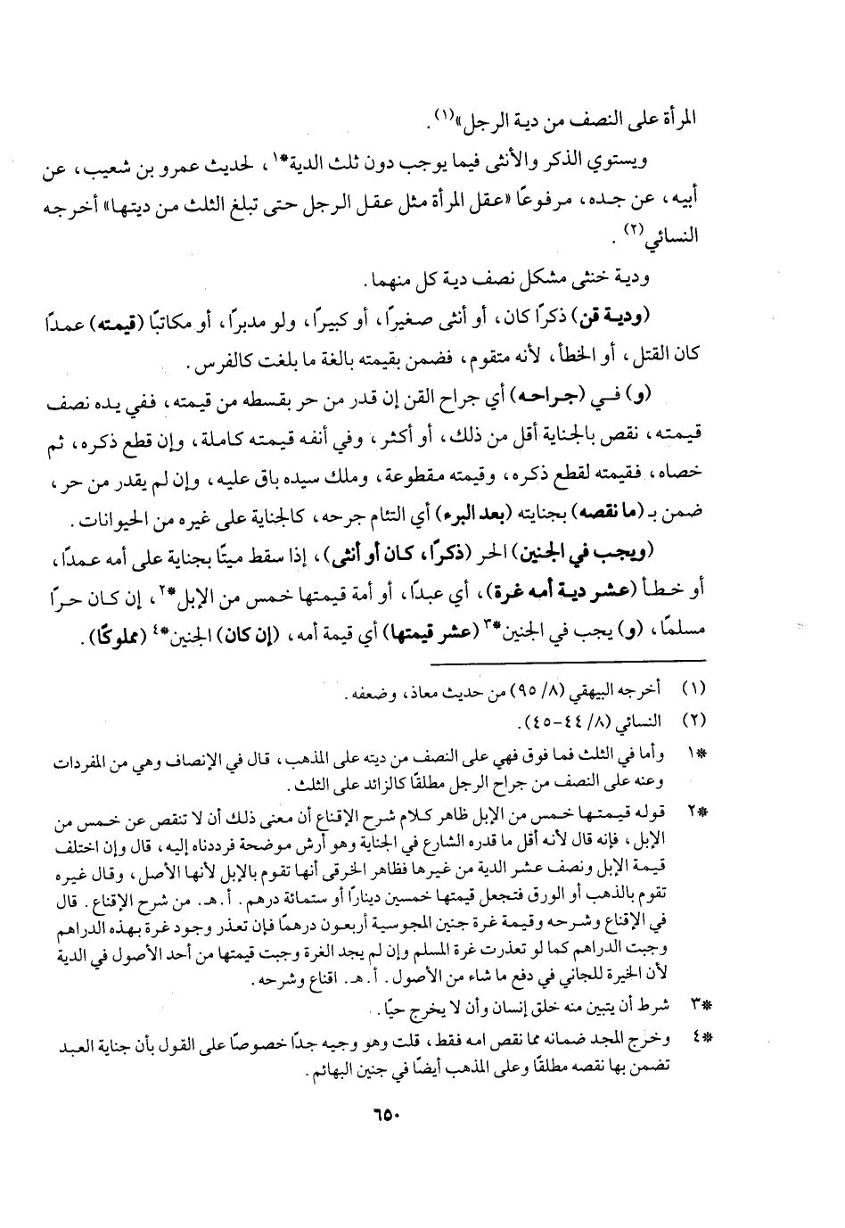 المرأة على النصف من دية الرجل» ويستوي الذكر والأنثى فيما يوجب ثلث الدية، لحديث عمرو بن شعيب، عن أبيه، عن جده مرفوعا «عقل المرأة مثل عقل الرجل حتى تبلغ الثلث من ديتها» أخرجه النسائي.