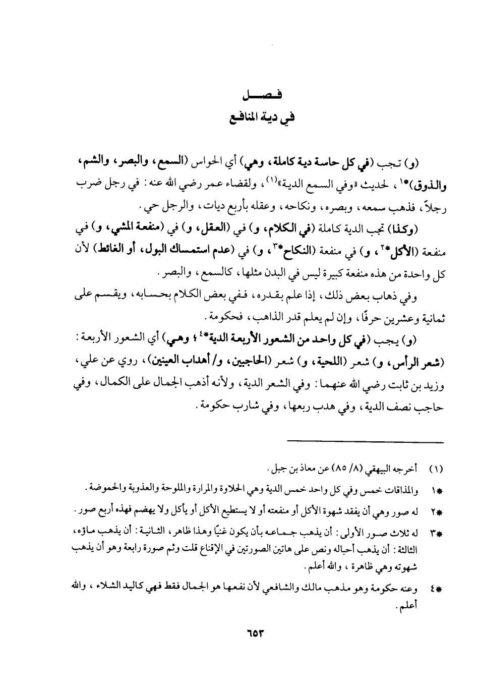 (في الكلام، و) في (العقل، و) في (منفعة المشي، و) في منفعة (الأكل، و) في منفعة (النكاح، و) في (عدم استمساك البول أو الغائط) لأن في كل واحد من هذه منفعة كبيرة ليس في البدن مثلها كالسمع والبصر، وفي ذهاب بعض ذلك إذا علم بقدره ففي بعض الكلام بحسابه، ويقسم على ثمانية وعشرين حرفا وإن لم يعلم قدر الذاهب فحكومة. (و) يجب (في كل واحد من الشعور الأربعة الدية؛ وهي) أي الشعور الأربعة (شعر الرأس و) شعر (اللحية و) شعر (الحاجبين وأهداب العينين) ، روي عن علي، وزيد بن ثابت - رَضِيَ اللَّهُ عَنْهُمَا -: وفي الشعر الدية، ولأنه أذهب الجمال على الكمال، وفي حاجب نصف الدية، وفي هدب ربعها وفي شارب حكومة،