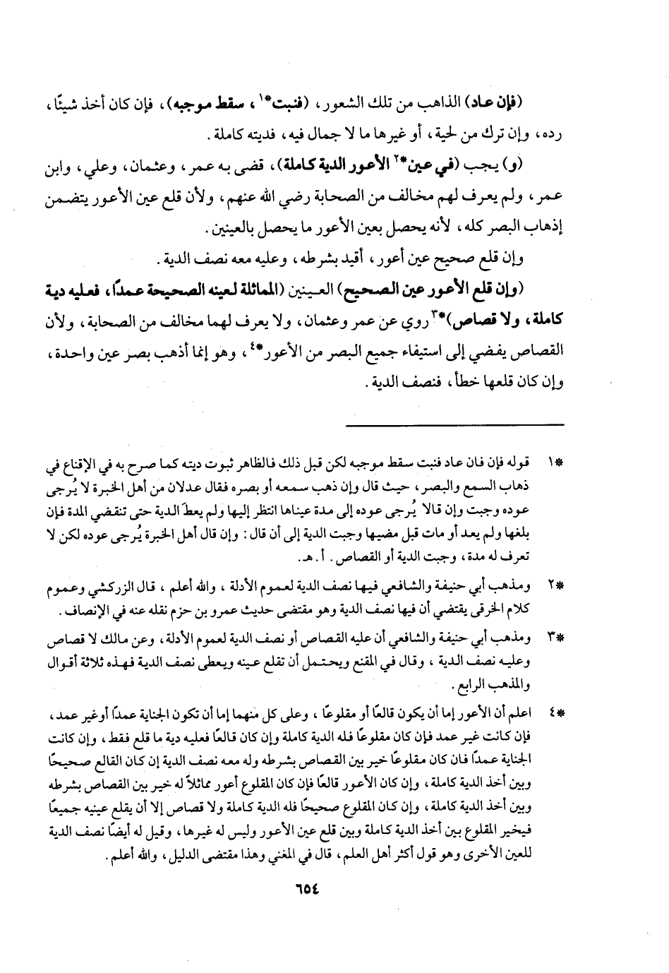 (فإن عاد) الذاهب من تلك الشعور (فنبتت سقط موجبه) ، فإن كان أخذ شيئا رده، وإن ترك من لحية أو غيرها مالا جمال فيه فدية كاملة. (و) يجب (في عين الأعور الدية كاملة) قضى به عمر وعثمان وعلي وابن عمر، ولم يعرف لهم مخالف من الصحابة - رَضِيَ اللَّهُ عَنْهُمْ -، ولأن قلع عين الأعور يتضمن إذهاب البصر كله، لأنه يحصل بعين الأعور ما يحصل بالعينين، وإن قلع صحيح عين أعور أقيد بشرطه وعليه معه نصف الدية. (وإن قلع الأعور عين الصحيح) العينين (المماثلة لعينه الصحيحة عمدا فعليه دية كاملة ولا قصاص) روي عن عمر وعثمان ولا يعرف لهما مخالف من الصحابة، ولأن القصاص يفضي إلى استيفاء جميع البصر من الأعور، وهو إنما أذهب بصر عين واحدة، وإن كان قلعها خطأ فنصف الدية.