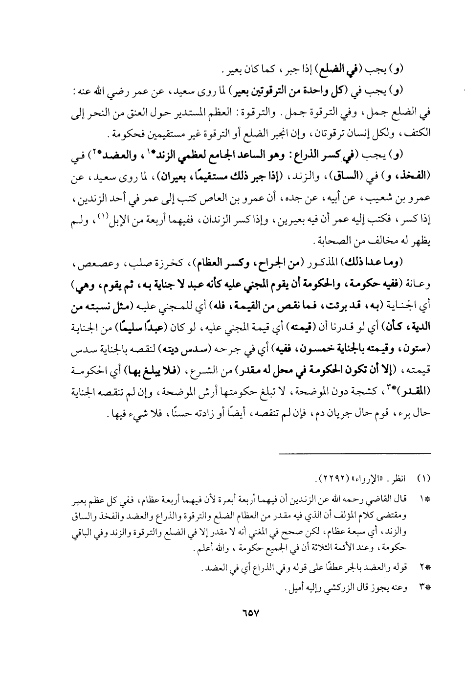 (و) يجب (في الضلع) إذا جبر كما كان بعير، (و) يجب في (كل واحدة من الترقوتين بعير) لما روى سعيد عن عمر - رَضِيَ اللَّهُ عَنْهُ -: في الضلع جمل وفي الترقوة جمل. والترقوة: العظم المستدير حول العتق من النحر إلى الكتف، ولكل إنسان ترقوتان، وإن انجبر الضلع أو الترقوة غير مستقيمين فحكومة (و) يجب (في كسر الذراع: وهو الساعد الجامع لعظمي الزند والعضد) في (الفخذ و) في (الساق) والزند (إذا جبر ذلك مستقيما بعيران) ؛ لما روى سعيد، عن عمرو بن شعيب، [عن أبيه، عن جده] ، أن عمرو بن العاص كتب إلى عمر في أحد