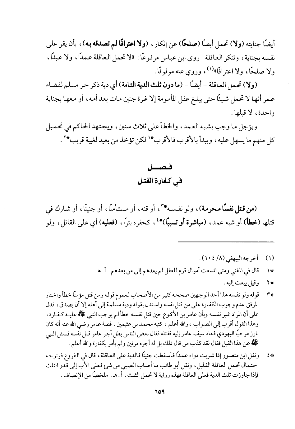 روى ابن عباس مرفوعا: «لا تحمل العاقلة عمدا ولا عبدا ولا صلحا ولا اعترافا» ، وروي عنه موقوفا. (ولا) تحمل العاقلة أيضا (ما دون ثلث الدية التامة) أي ذكر حر مسلم لقضاء عمر أنها لا تحمل شيئا حتى يبلغ عقل المأمومة إلا غرة جنين مات بعد أمه أو معها بجناية واحدة لا قبلها، ويؤجل ما وجب بشبه العمد والخطأ على ثلاث سنين، ويجتهد الحاكم في تحميل كل منهم ما يسهل عليه، ويبدأ بالأقرب فالأقرب لكن تؤخذ من بعيد لغيبة قريب.