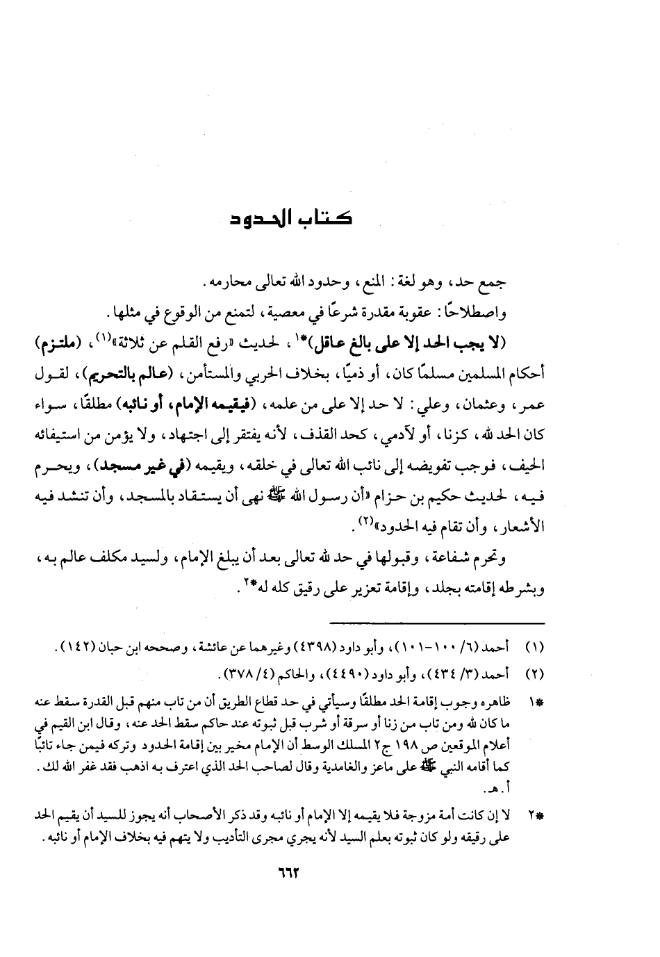 (لا يجب الحد إلا على بالغ عاقل) لحديث «رفع القلم عن ثلاثة» ، (ملتزم) أحكام المسلمين مسلما كان أو ذميا بخلاف الحربي والمستأمن، (عالم بالتحريم) لقول عمر وعثمان وعلي: لا حد إلا على من علمه، (فيقيمه الإمام أو نائبه مطلقا) سواء، كان الحد لله كحد الزنا، أو لآدمي كحد القذف، لأنه يفتقر إلى اجتهاد، ولا يؤمن من استيفائه الحيف فوجب تفويضه إلى نائب الله تعالى في خلقه، ويقيمه (في غير مسجد) ، وتحرم فيه لحديث حكيم بن حزام «أن رسول الله - صَلَّى اللَّهُ عَلَيْهِ وَسَلَّمَ - نهى أن يقاد في بالمسجد، وأن تنشد فيه الأشعار، وأن تقام فيه الحدود» وتحرم شفاعة وقبولها في حد الله تعالى بعد أن يبلغ الإمام، ولسيد مكلف عالم به وبشروطه إقامته بجلد وإقامة تعزير على رقيق كله له.