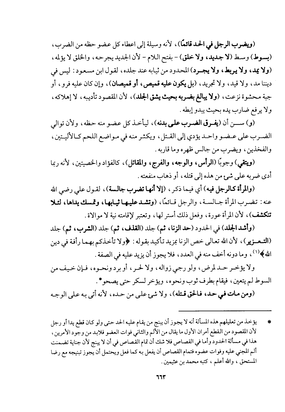 حظه، ولأن توالي الضرب على عضو واحد يؤدي إلى القتل، ويكثر منه في مواضع اللحم كالأليتين والفخذين، ويضرب من جالس ظهره وما قاربه. (ويتقي) وجوبا (الرأس والوجه والفرج والمقاتل) ، كالفؤاد والخصيتين، لأنه ربما أدى ضربه على شيء من هذه إلى قتله أو ذهاب منفعته، (والمرأة كالرجل فيه) أي فيما ذكر، (إلا أنها تضرب جالسة) لقول علي - رَضِيَ اللَّهُ عَنْهُ -: تضرب المرأة جالسة والرجل قائما، (وتشد عليها ثيابها وتمسك يداها لئلا تنكشف) ، لأن المرأة عورة وفعل ذلك بها أستر لها وتعتبر لإقامته نية لا موالاة.